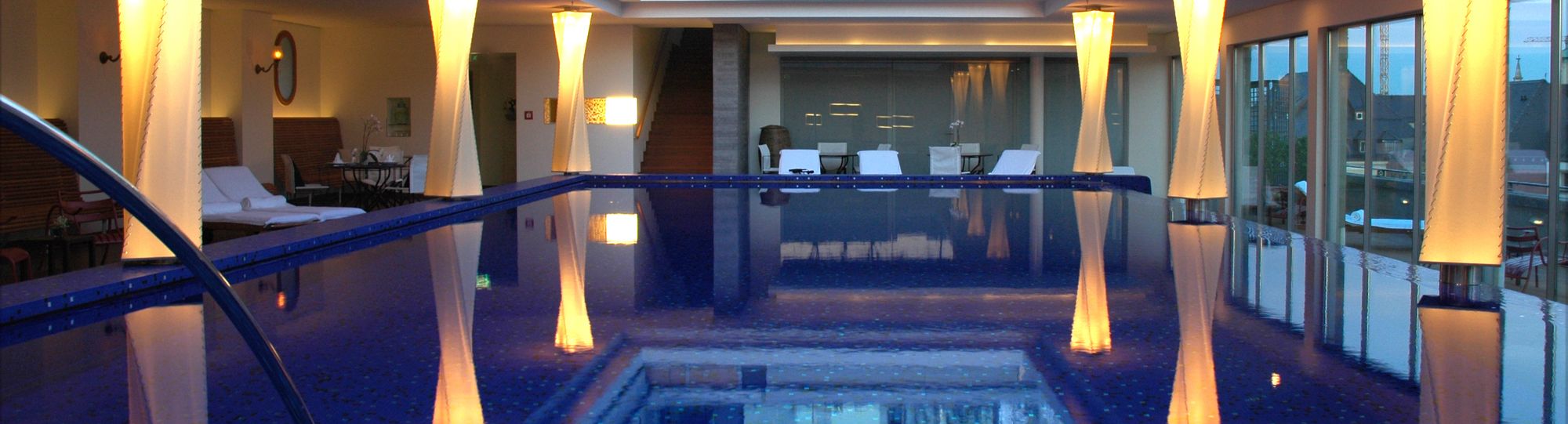 Schwimmen Sie im 6,50 x 14,50 m großen Pool - bei schönem Wetter, unter freiem Himmel, denn das zu öffnende Glasdach macht es möglich. Ist es draußen weniger warm, sorgt der offene Kamin für wohlige Wärme. Unser Saunaangebot reicht von der besonders sanften Biosauna mit Farbtherapie im Damenbereich über die gemischte finnische Sauna mit Aufgüssen bis hin zum klassischen Aromadampfbad. Ein Tauchbecken und ein separater Ruheraum unterstützen die Regeneration. Ein Solarium und Münchens schönste Sonnenterrasse mit Blick über die Stadt lassen keinen Wunsch mehr offen.