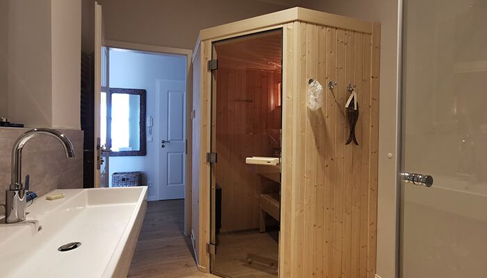66m², 2 Zimmer, 2 Personen, Balkon, seitlicher Hafenblick, Sauna, Gäste WC