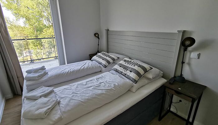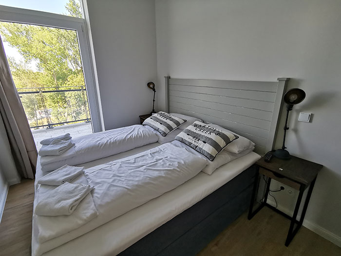 50-55m², 2 Zimmer, 2 Personen, 2 Balkone, seitlicher Hafenblick, Hunde erlaubt