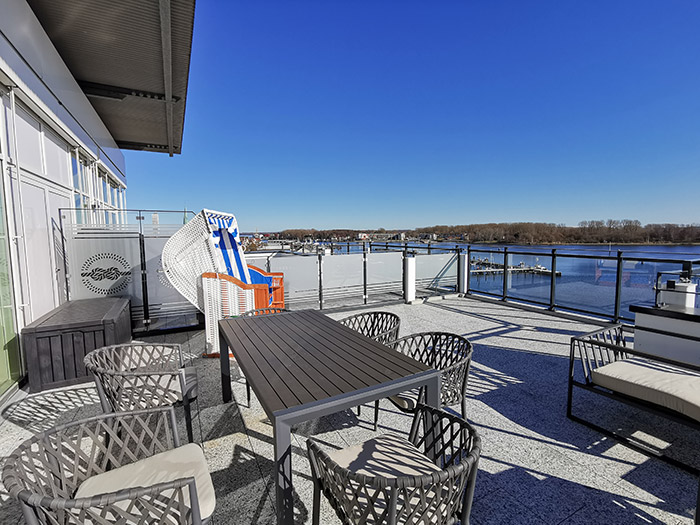 115 m², 3 Zimmer, 4 Personen, Dachterrasse, 2. Balkon, direkter Hafenblick, Gäste WC, Sauna