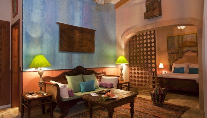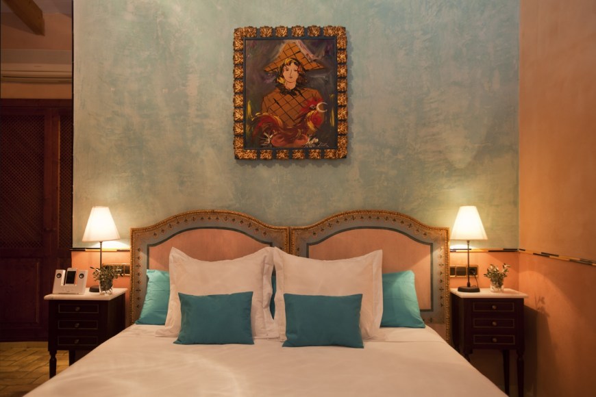 Junior Suite im Bereich des romanischen Kreuzgangs mit Terrasse und Wohnbereich auf der Veranda mit Blick auf den Garten, individuell mit Kunstwerken aus verschiedenen Teilen der Welt dekoriert.