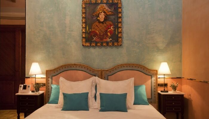 Doppelzimmer mit Terrasse und Zugang zum Garten, individuell dekoriert mit Kunstwerken aus unterschiedlichen Teilen der Welt..