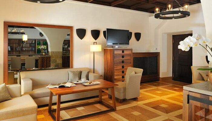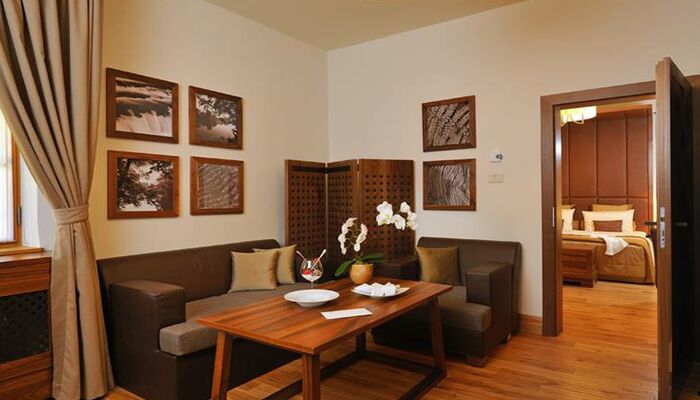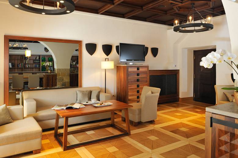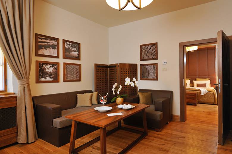 Jede der zwei Junior Suiten bietet einen Ausblick auf den traumhalfen Krka Fluss und den sorgfältig gefelgten Schlosspark und verfügt neben einem Schlafzimmer für zwei Personen ebenso über ein Wohnzimmer. Die erlesene Zimmerausstattung in warmen braunen Farben und aus natürlichen Materialien wirkt beruhigend und vermittelt Sicherheit. Das königliche Badezimmer mit winkelförmiger Massagewanne und Bidet gewährleistet eine bequeme Unterkunft nach einem anstrengenden Tag.