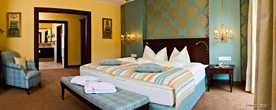 Schon von außen verspricht die prachtvolle Architektur des 5* Grandhotel Lienz außergewöhnliche Großzügigkeit. Diese Noblesse bestimmt tatsächlich jeden Raum unseres Hauses, strahlt in unseren Zimmern und Suiten wider und führt mit vielen stilvollen Details zu vornehmer Eleganz, Ambiente und Flair. Die lichtdurchfluteten Räume und ihr besonderes Wohnambiente sind ideal zum bewussten Zelebrieren von Momenten, die nur Ihnen allein gehören sollen. 72 Zimmer, zum Teil mit separaten Kinderzimmern, sowie 4 Royal-Suiten stehen zu Ihrer Auswahl. Sämtliche Zimmer verfügen über schöne Aussichten auf die umliegenden Berge.