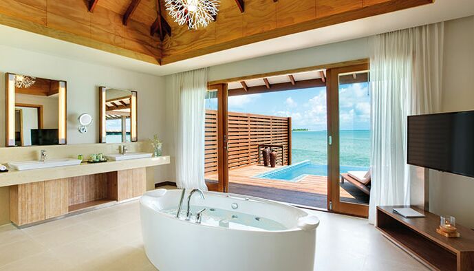 Direkt über der kristallklaren Lagune auf Stelzen gebaut sind die Villen elegant eingerichtet und verfügen über zwei Schlafzimmer und zwei Badezimmer, sowie eine große Sonnenterrasse und einen privaten Infinity Pool.