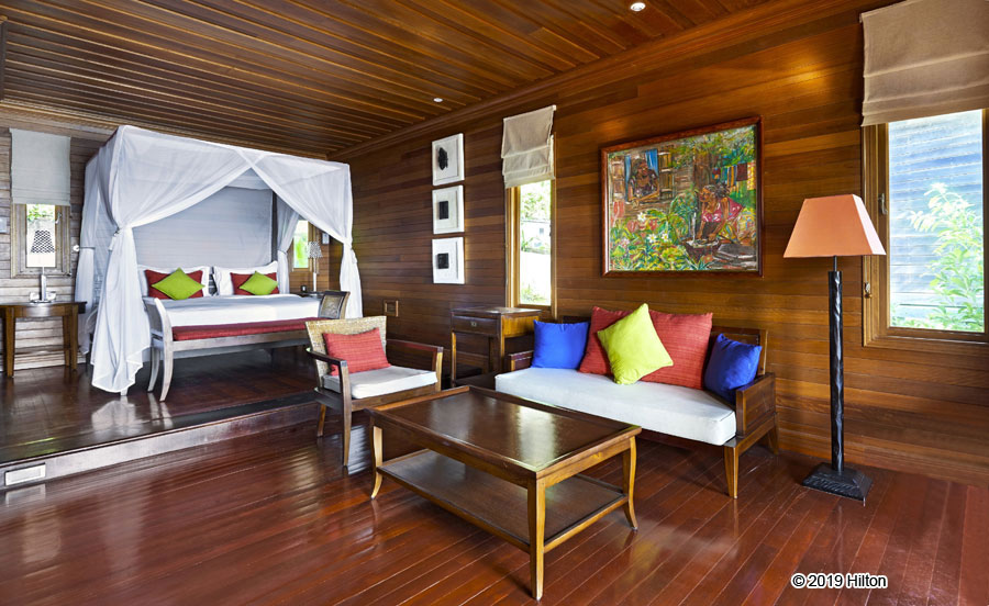 Genießen Sie einen romantischen Aufenthalt in dieser 90 m² großen Luxusvilla, die auf Stelzen über dem Indischen Ozean ragt und einen atemberaubenden Ausblick sowie direkten Zugang zum Strand bietet. Entspannen Sie sich auf dem Sofa oder im großen Sessel mit Ottomane vor dem 42-Zoll LCD-Fernseher. Das King-Size-Bett sorgt für erholsamen Schlaf.