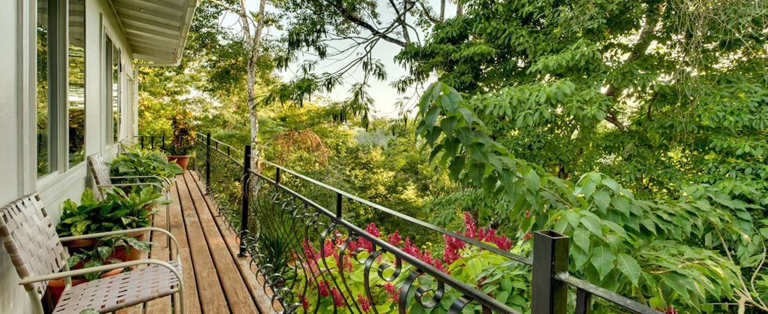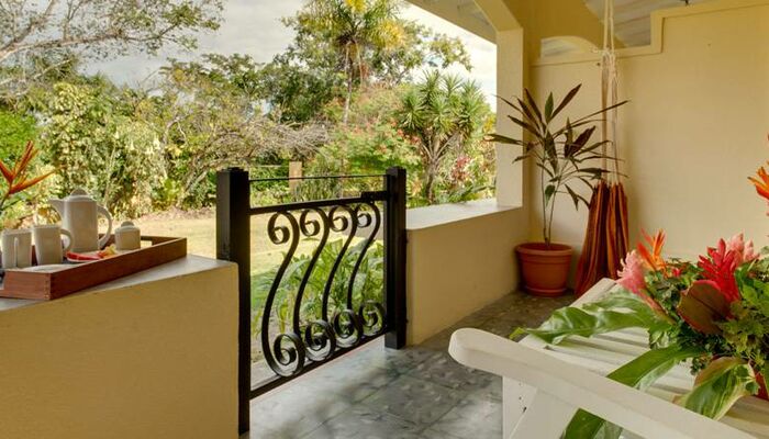 Unsere Zimmer mit Balkon verfügen über einen eigenen Balkon mit Gartenmöbeln und Hängematten, ideal für einen erholsamen Urlaub. Diese Zimmer bieten Blick auf einen Garten und ein Dschungelüberdachung. Dank ihrer Lage im ersten Stock sind sie leicht zugänglich. Zimmer mit Balkon sind entweder mit 1 Kingsize-Bett oder 1 Queensize-Bett und 1 Doppelbett verfügbar. Alle Zimmer sind mit farbigen Gemälden talentierter Künstler aus Belize ausgestattet.