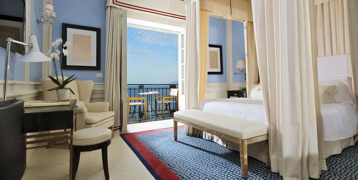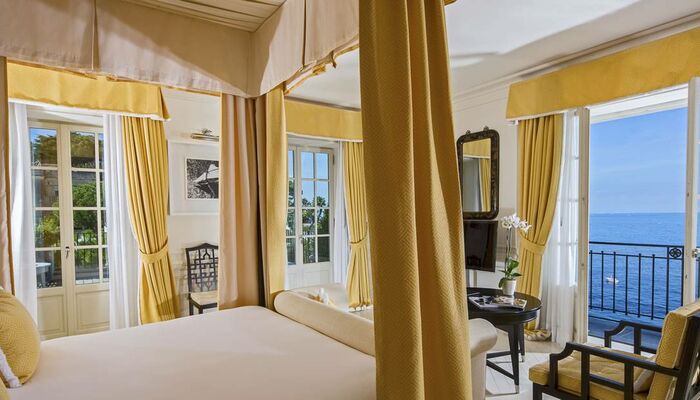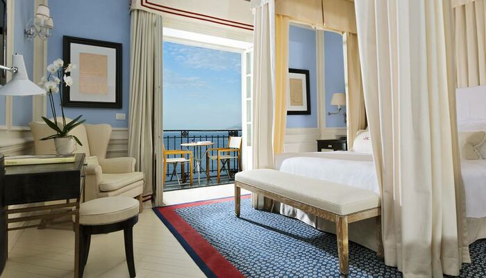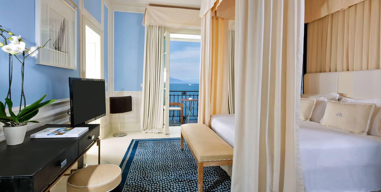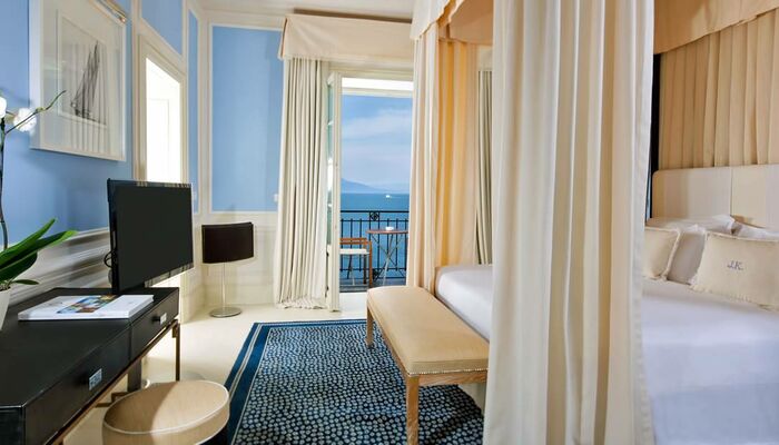 Großzügiges Zimmer mit 50 m2 mit romantischem Blick auf den Golf von Neapel. Die Junior Suite verfügt über einen Balkon mit Meerblick, der mit einem Tisch und Stühlen ausgestattet ist. Ausgestattet mit dem modernsten Komfort: LCD-Fernseher, DVD-Player, Minibar, WiFi-Internetzugang, Klimaanlage, Schrankkabine, Tresor, Begrüßungsset JK.