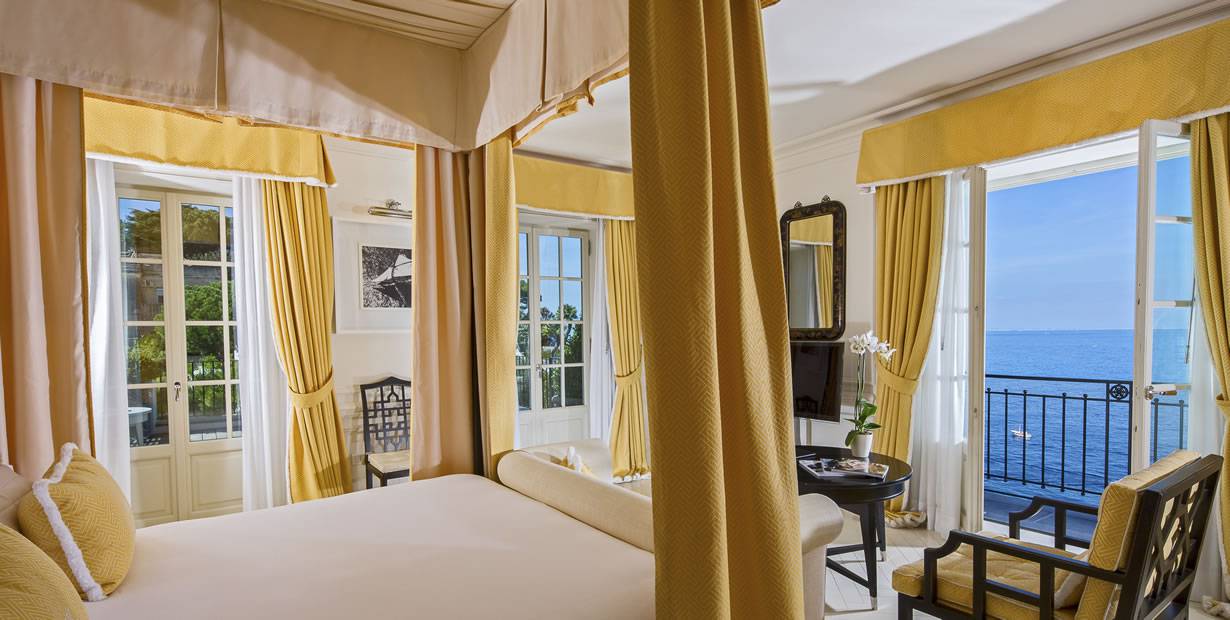 Bequemes Zimmer mit 40 m2 mit kleinem Balkon mit Meerblick, der mit einem Tisch und Stühlen ausgestattet ist. Ausgestattet mit dem modernsten Komfort: LCD-Fernseher, DVD-Player, Minibar, WiFi-Internetzugang, Klimaanlage, Schrankkabine, Tresor, Begrüßungsset JK.
