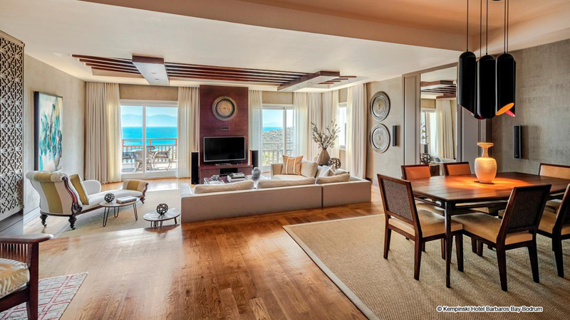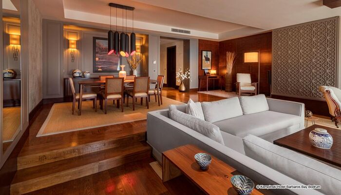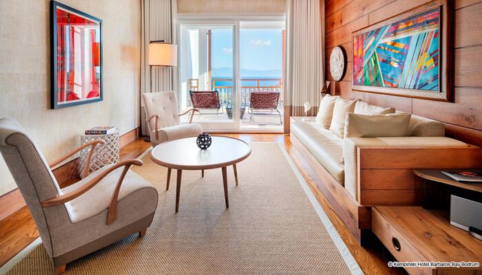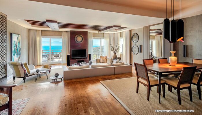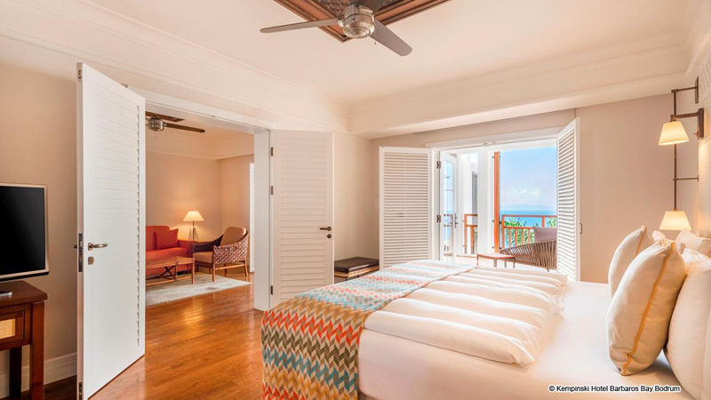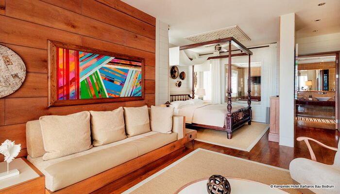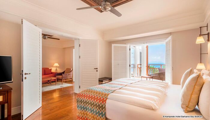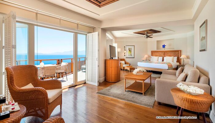Die Suiten im Kempinski Hotel Barbaros Bay Bodrum wurden entworfen, um den spektakulären Meerblick durch modernes Dekor, private Balkone, Minibars und mehr zu verbessern.