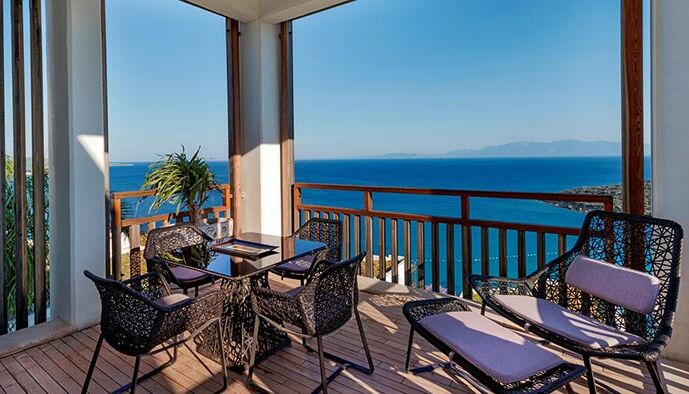 Alle Junior Suiten bieten bis zu 55 m² luxuriösen Wohnraum, alle mit kombinierten Schlafzimmern und Wohnbereichen, einschließlich eines Balkons oder einer Terrasse mit Meerblick.