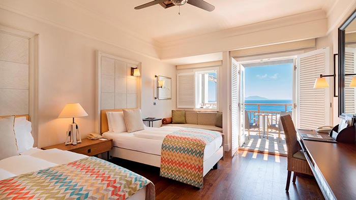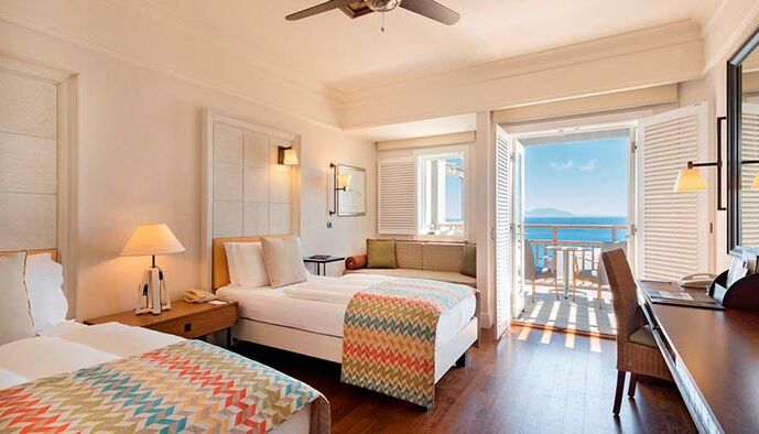 Die Grand Deluxe Zimmer verfügen über einen eigenen Balkon oder eine Terrasse mit Panoramablick auf das Meer, eine Kombination aus Bad und Dusche mit separatem WC, Klimaanlage, stilvollem Deckenventilator, Sofa / Bank nach Verfügbarkeit, LED-Sat-TV und Verstärker. Telefon, Minibar, Espressomaschine, Zimmersafe, Haartrockner, Auswahl an Kissen, Pflegeprodukte.
