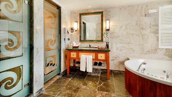 Diese komfortablen Suiten sind mit einem eigenen begehbaren Balkon oder einer Terrasse mit Meerblick, einer Badewannen- / Duschkombination mit separatem WC, Klimaanlage, stilvollem Deckenventilator, Sofa, LED-Sat-TV und Telefon, Minibar, Zimmersafe, Haartrockner und Espresso ausgestattet Maschine, Auswahl an Kissen, Salvatore Ferragamo Badezimmer Annehmlichkeiten.