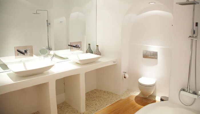Das schicke und frische moderne Design und der luxuriöse Innen-Whirlpool, mit einem zauberhaften Blick auf die Caldera bilden zusammen mit dem luxuriösen Schlafzimmer, dem stilvollen Wohn- und Essbereich, dem prächtigen Badezimmer mit Badewanne oder Dusche und der privaten Veranda mit Meerblick.