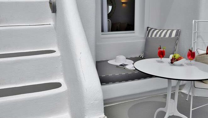 ALLE SUPERIOR SUITES bieten: Ungefähre Größe 40 m2, Schlafzimmer, Offener Sitz- und Essbereich, Drinnen zwei Säulen Jacuzzi, Badezimmer mit Dusche, Veranda mit Blick auf die Caldera, Platz für bis zu 3 Personen.