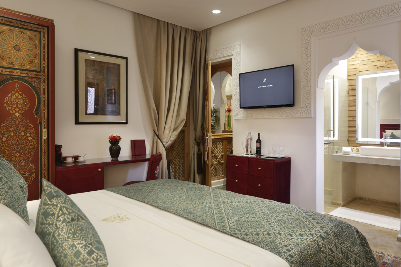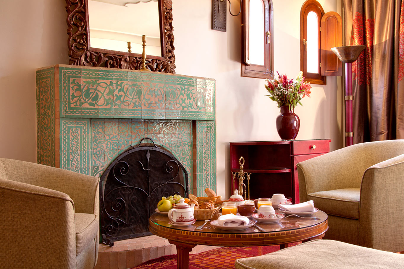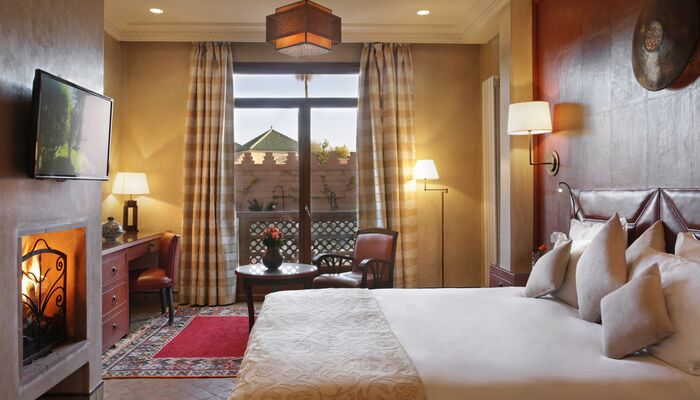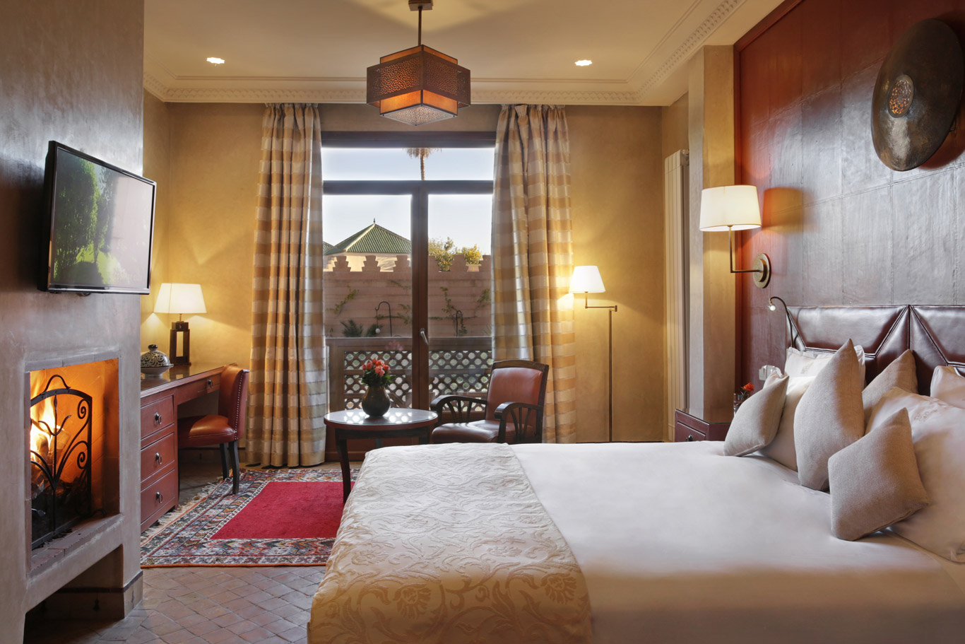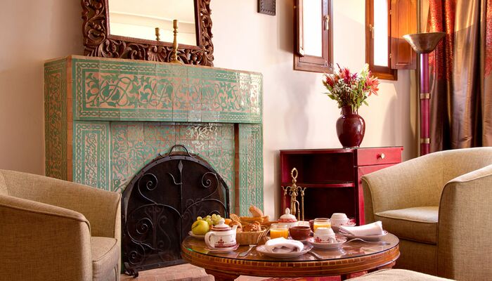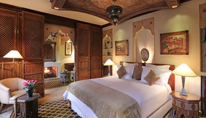 Unsere Ambassador Suite ist der Gipfel des Luxus und verbindet marokkanisches Design mit westlicher Kunst und Einrichtung. Diese prächtige Suite verfügt über einen großen Wohnbereich mit Kamin, ein separates Schlafzimmer mit einem Kingsize-Bett und einem angeschlossenen Badezimmer sowie einen Ankleidebereich, der im aufwendigen und authentischen Stil einer vergangenen Ära dekoriert ist.