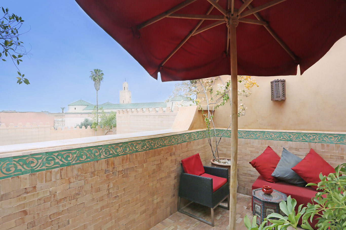 Unsere Duplex-Suiten sind ideal für Familien oder Personen, die den Luxus von mehr Platz suchen. Der erste Stock verfügt über ein Schlafzimmer und ein eigenes Badezimmer mit Badewanne und separater Dusche. Im Erdgeschoss befindet sich ein großer Salon mit Kamin, der in ein zweites Schlafzimmer umgewandelt werden kann, sowie ein Badezimmer. Eine private Dachterrasse mit Whirlpool bietet den Höhepunkt des Genusses mit einem faszinierenden Blick auf die Medina.