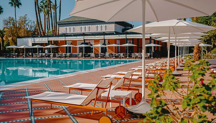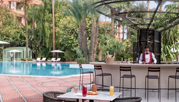 Das ikonische Schwimmbad La Mamounia ist selbst legendär. Der angrenzende Pavillon empfängt unsere Gäste bereits ab dem Frühstück, wo sie sich bei sagenhafter Aussicht ihren lukullischen Genüssen hingeben können.