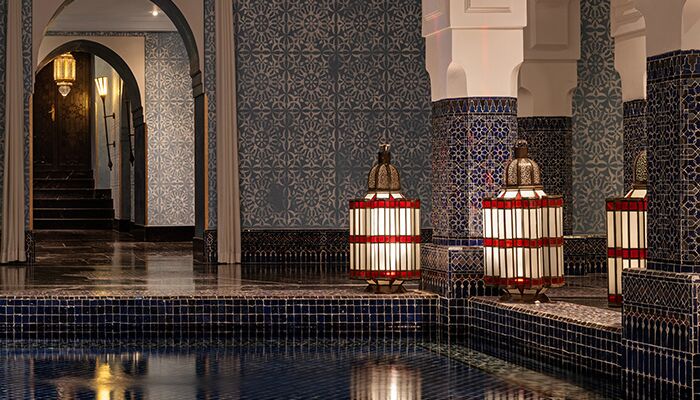 Folgen Sie der Treppe und lassen Sie sich vom Hell-Dunkel-Effekt der Laternen zum Spa von La Mamounia führen. Das Spa im La Mamounia ist ein wahres Heiligtum, das der Schönheit und dem Wohlbefinden gewidmet ist. Diese riesige Anlage umfasst 2.500 m².