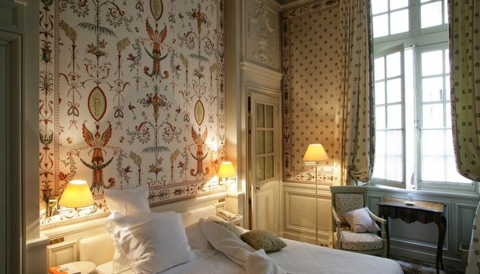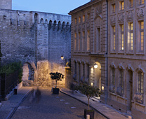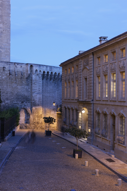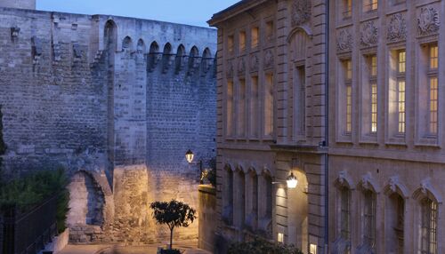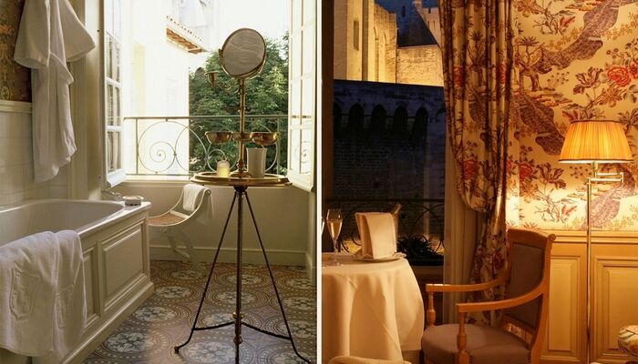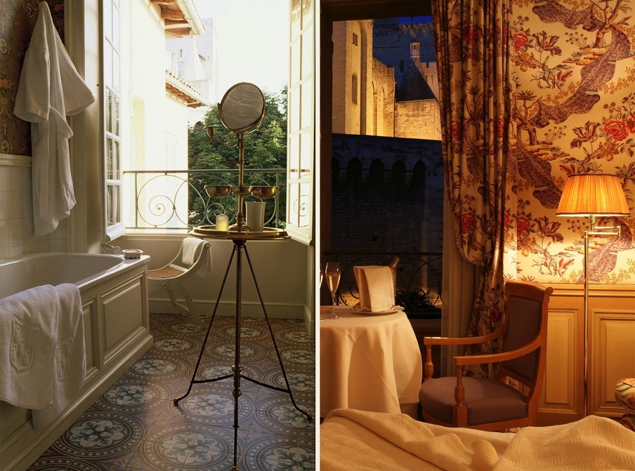 26 exquisit intime Schlafzimmer, individuell dekoriert mit historischen französischen Baumwolldrucken. La Rivière enchantée, La Roseraie, Le Grand Corail, Le Bambou, La Corne d’abondance, Le Perroquet, Le Singe savant..., die Namen der großen Baumwolldrucke der Vergangenheit laden zum Reisen ein. Eine Träumerei, die durch den kontrastierenden und allgegenwärtigen Blick auf die strenge und himmelwärts gerichtete Fassade des Papstpalastes, einer gotischen Festung aus dem frühen 14.