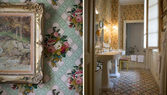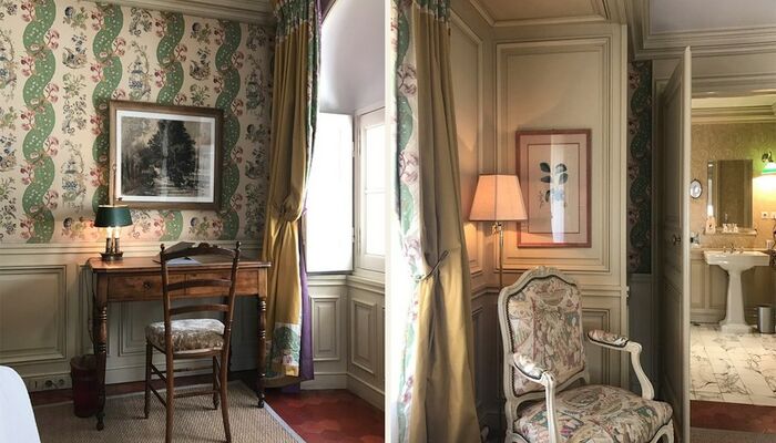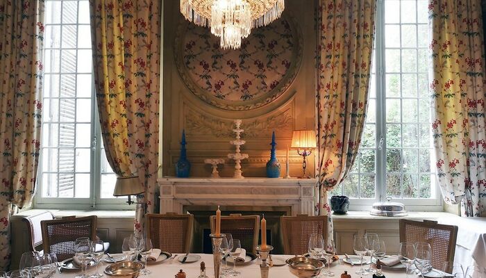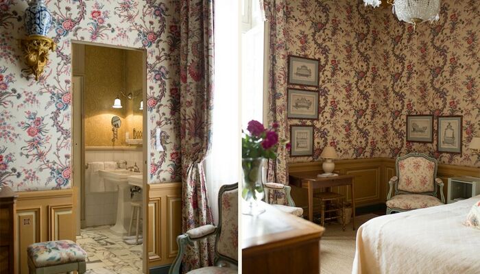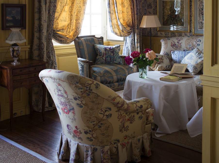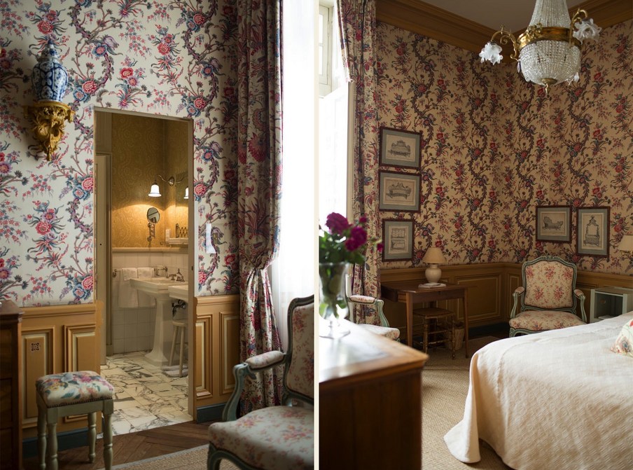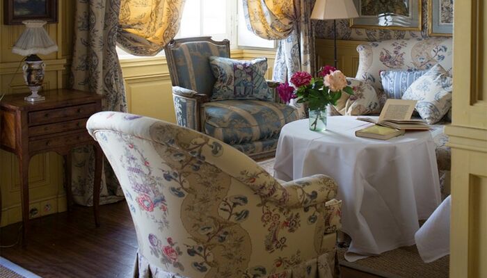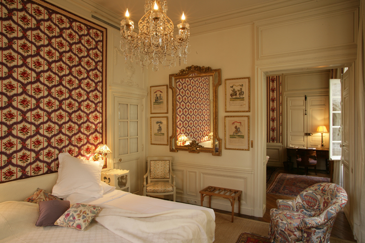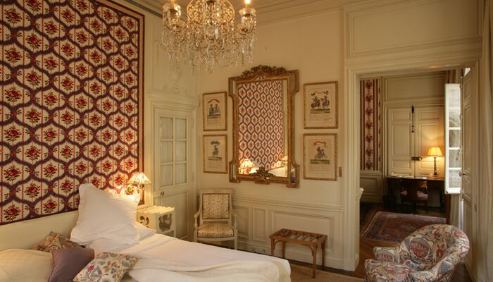 In jedem Raum betont die bemalte Holzvertäfelung einen anderen Wandteppich, der Nachdruck des uralten üppigen Chintz oder Toile de Jouy, der den seidengefütterten Vorhängen entspricht und schwer, aber sanft auf den Boden fällt. La Mirande bietet eine Vielzahl von Meisterwerken, Textilien, die von den Originalabzügen reproduziert werden, die identisch sind mit denen, die unsere Vorfahren bewundert haben und die an das 18. Jahrhundert erinnern, Siècle des Lumières.