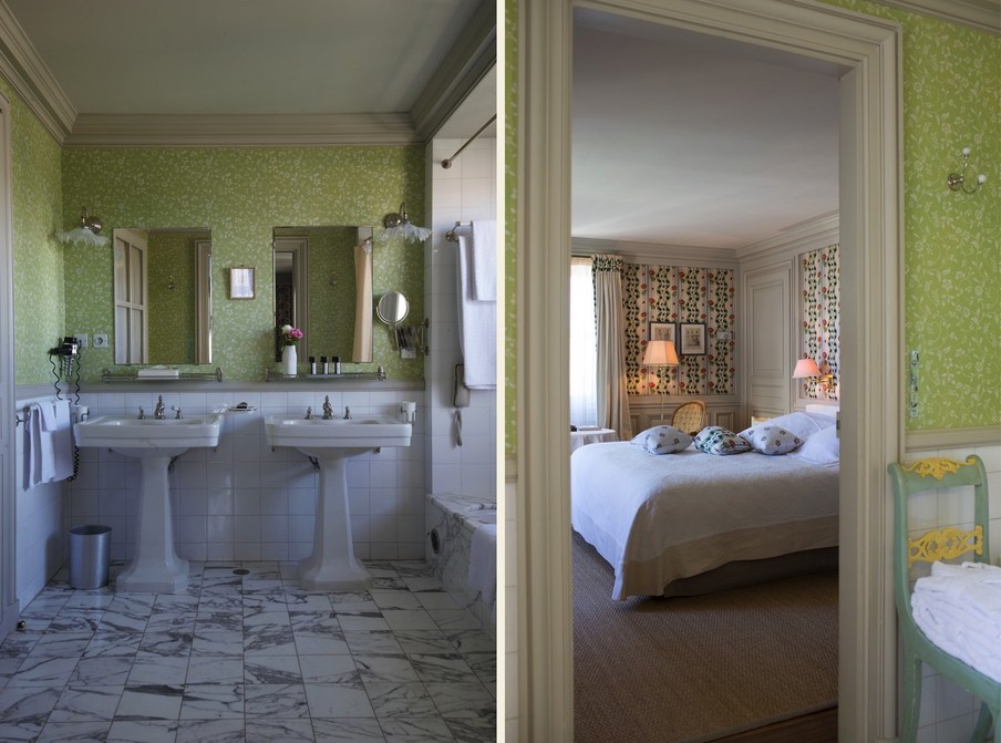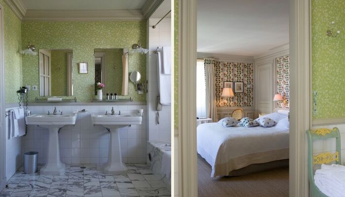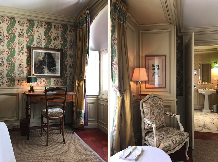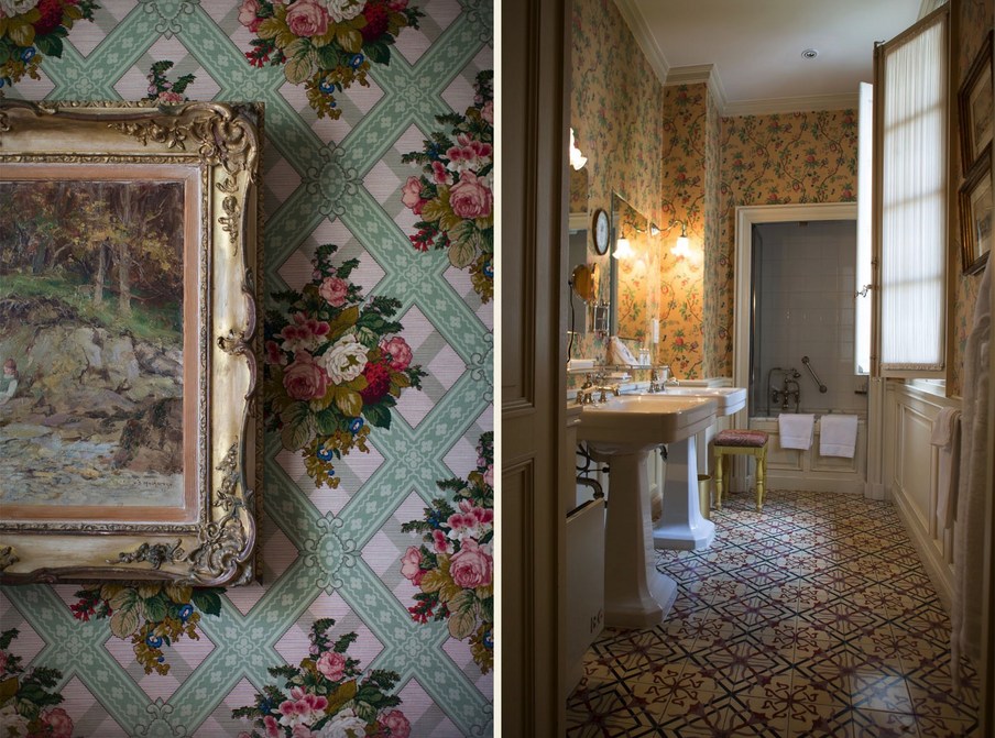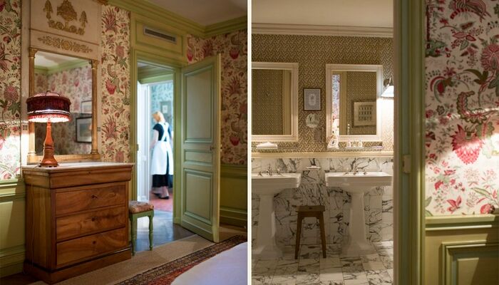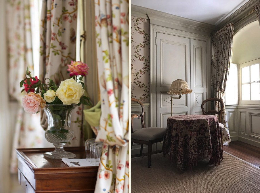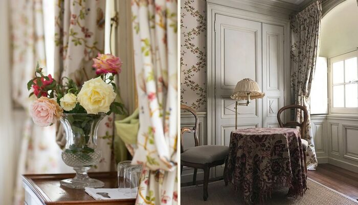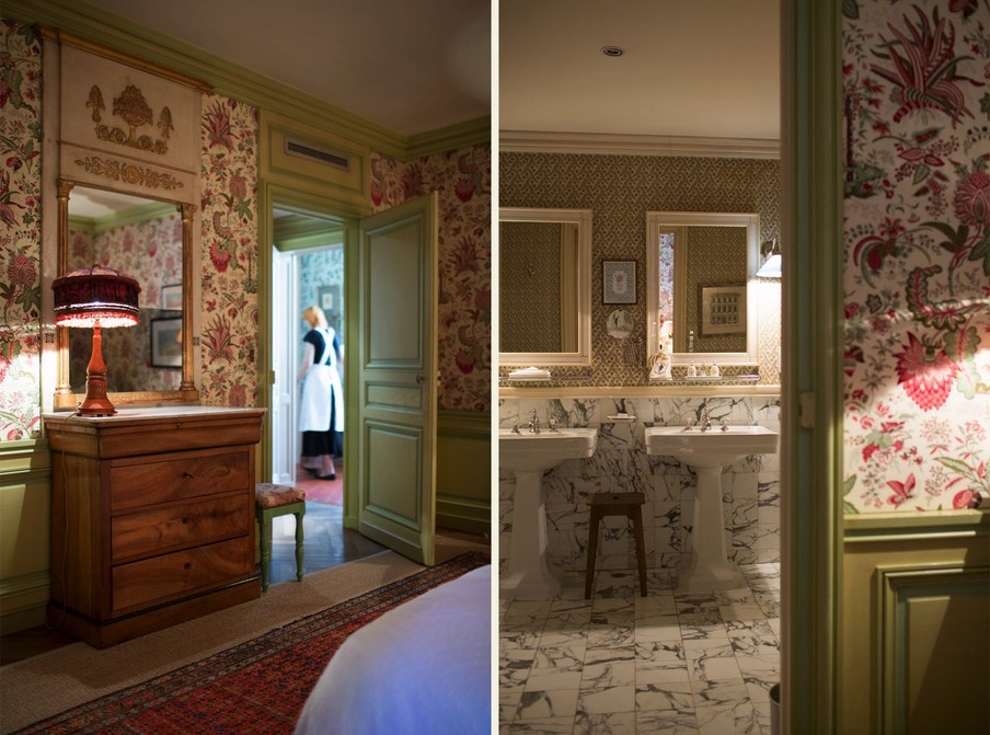 In jedem Raum betont die bemalte Holzvertäfelung einen anderen Wandteppich, der Nachdruck des uralten üppigen Chintz oder Toile de Jouy, der den seidengefütterten Vorhängen entspricht und schwer, aber sanft auf den Boden fällt. La Mirande bietet eine Vielzahl von Meisterwerken, Textilien, die von den Originalabzügen reproduziert werden, die identisch sind mit denen, die unsere Vorfahren bewundert haben und die an das 18. Jahrhundert erinnern, Siècle des Lumières.