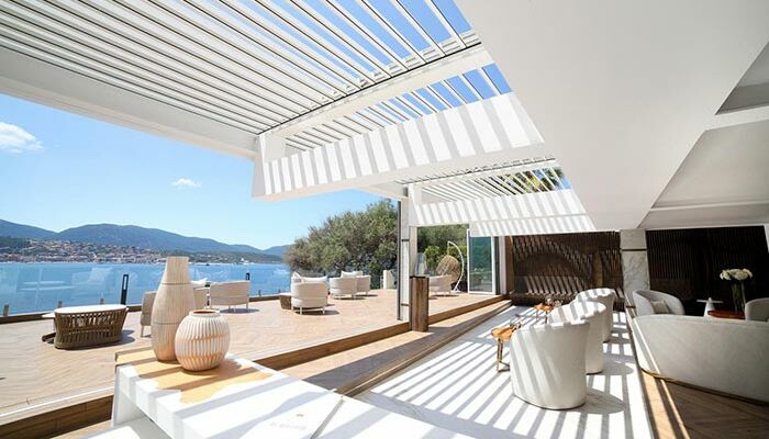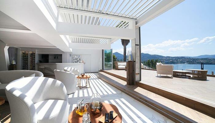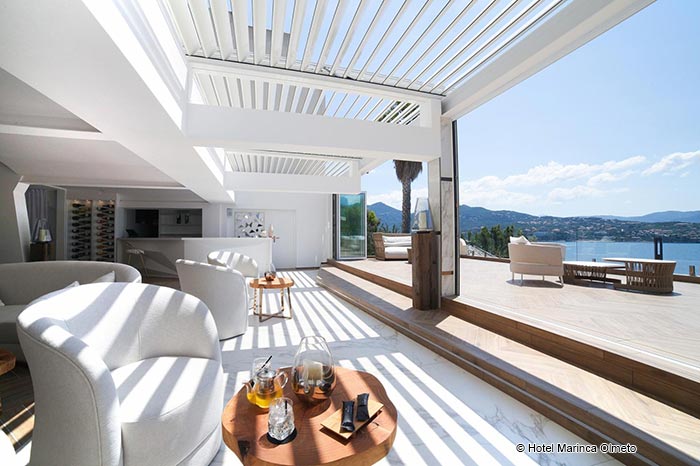 <p>Panoramablick auf das Meer auf den letzten beiden Ebenen der Einrichtung mit Terrasse zwischen 9m2 und 6m2 und Sonnenliegen</p>