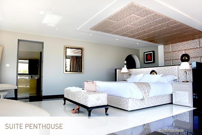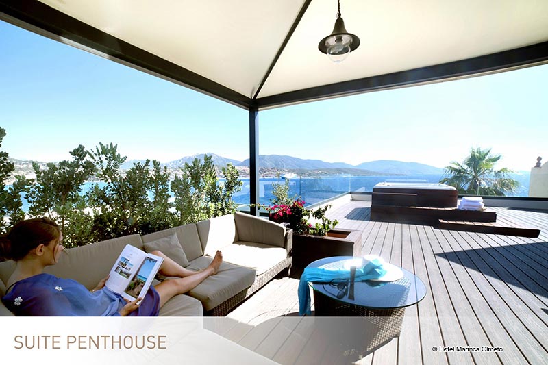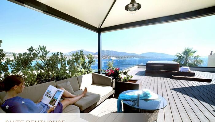 <p>Penthouse-Suite<br>Elegantes Dekor<br>230 qm2: (Raum 110qm2 und Terrasse 120qm2)<br>Platz für 4 Erwachsene<br>Kingsize-Bett oder Twin-Betten mit Cocooning-Konzept<br>Ein Hauptschlafzimmer mit en-suite Badezimmer mit italienischer Dusche und Badewanne mit Meerblick und großem Kleiderschrank<br>Ein Schlafzimmer mit eigenem Bad<br>Guerlain ® Annehmlichkeiten<br>Nespresso ® Kaffeemaschine<br>Separates WC<br>120 m² große Panoramaterrasse mit Lounge, privatem Whirlpool und Sonnenliegen</p>