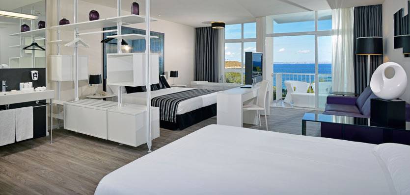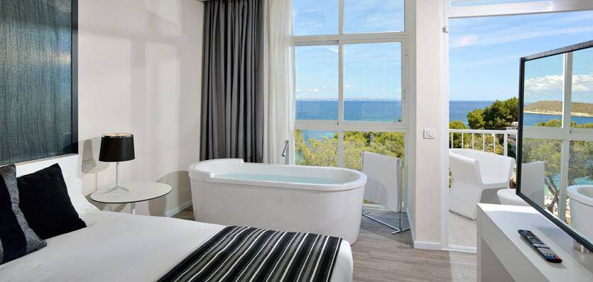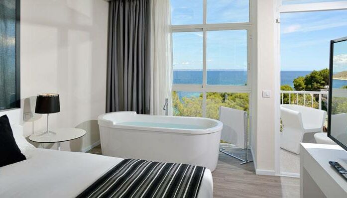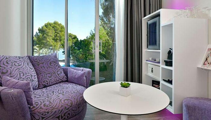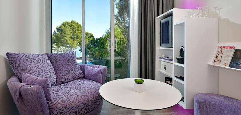 Unsere Chic-Suiten bieten ganze 52 m² Wohnfläche und sind besonders schön eingerichtet. Neben einem Essbereich verfügen Sie hier auch über einen privaten Spabereich mit Blick auf das Mittelmeer. Die Fenster reichen vom Boden bis zur Decke und bieten einen herrlichen Ausblick auf den Strand von Calvia.