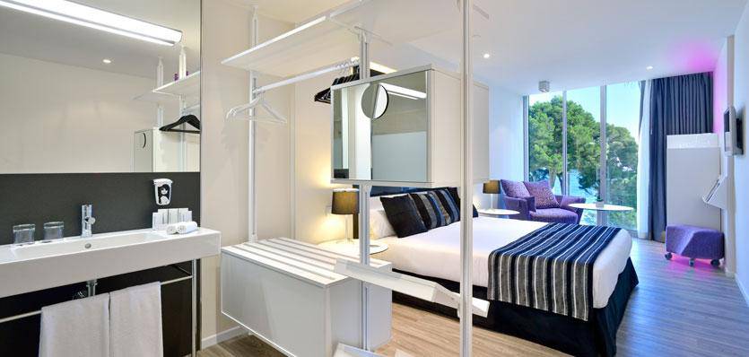 Mit ihrer minimalistischen Einrichtung, die das lebendige Ambiente unterstreichen, sind unsere Aura Rooms die ideale Wahl für Gäste, die sich im Urlaub entspannen und gleichzeitig das umfangreiche Angebot genießen möchten. Die Zimmer sind geräumige 28 m² groß. Das frische Ambiente wird durch die großen Fenster unterstrichen. Durch eine Glastür erreicht man die private, möblierte Terrasse mit Blick auf die herrliche Bergwelt von Calvia.