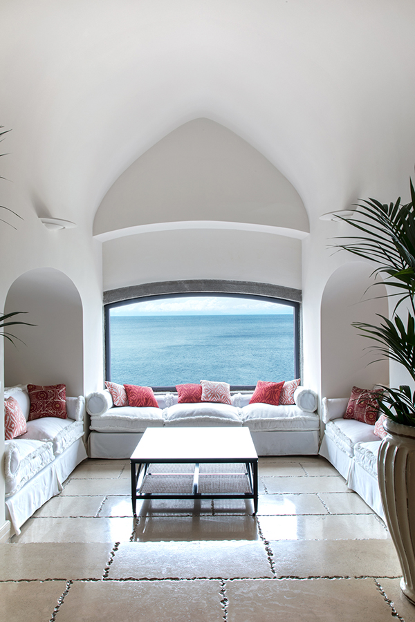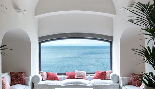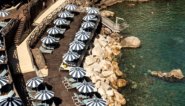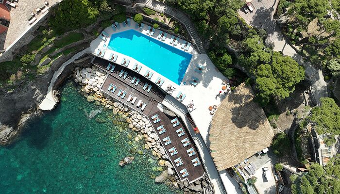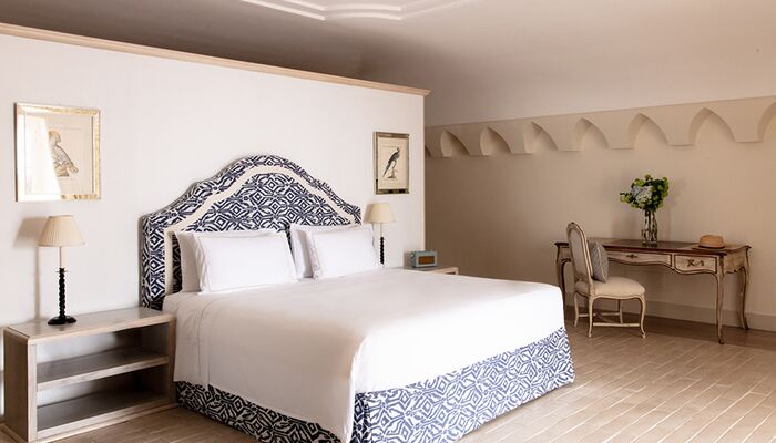 Terrasse mit Meerblick und Whirlpool, auf einer Klippe mit Blick auf das Meer gelegen, bietet die Grand Suite eine atemberaubende Aussicht. Üppige Vorhänge, emaillierte Wände, helle Böden in warmen Farben: alles trägt zu einer besonderen mediterranen, raffinierten Atmosphäre bei. Die Grand Suite ist mit Satellitenfernsehen mit LCD-Bildschirm, DVD, Heimkino und iPod mit Bose Sound Station ausgestattet. Das große Badezimmer verfügt über eine Whirlpool-Badewanne und eine separate Dusche, ein Doppelwaschbecken, ein Bidet, einen Haartrockner, ein Telefon und einen Kosmetikspiegel. Es ist nach dem höchsten technischen Standard eingerichtet und verfügt über handgeschnittene Wand- und Bodenfliesen. Es bietet einen spektakulären Blick auf die Bucht von San Montano. Die große private Terrasse mit Blick auf das Meer ist mit Stühlen und einem Solarium ausgestattet und verfügt auch über einen Mini-Whirlpool.