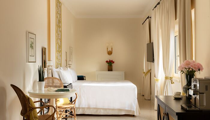 Terrasse mit Meerblick – Gebäude Serra & Foresteria, im Park gelegen – Gebäude Serra & Foresteria – mit Meerblick und Terrasse – Ein Doppelbett. Jedes Zimmer verfügt über schöne Möbel und Farben, einen Einbauschrank, einen Tisch und eine Konsole, 2 Telefone (eines im Badezimmer), Sat-TV, Minibar, ein Badezimmer mit Marmorwaschbecken, Bidet, Badewanne, Haartrockner und Kosmetikspiegel. Klimaanlage. Zimmersafe.