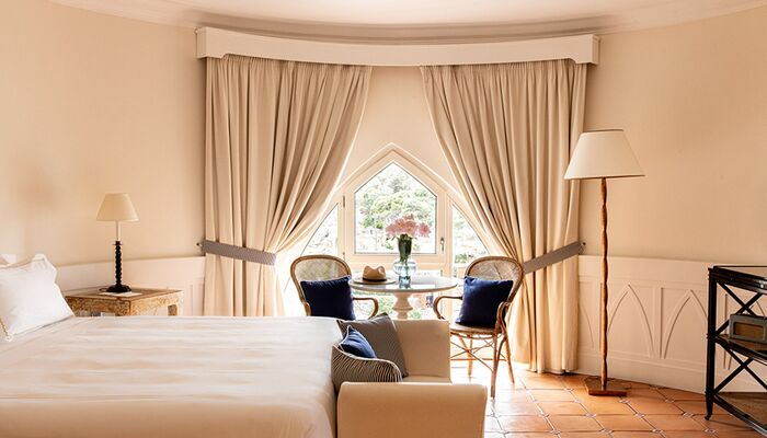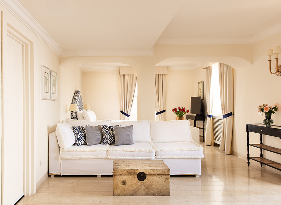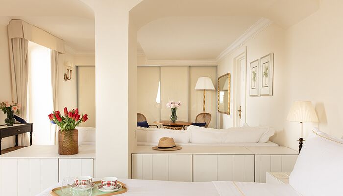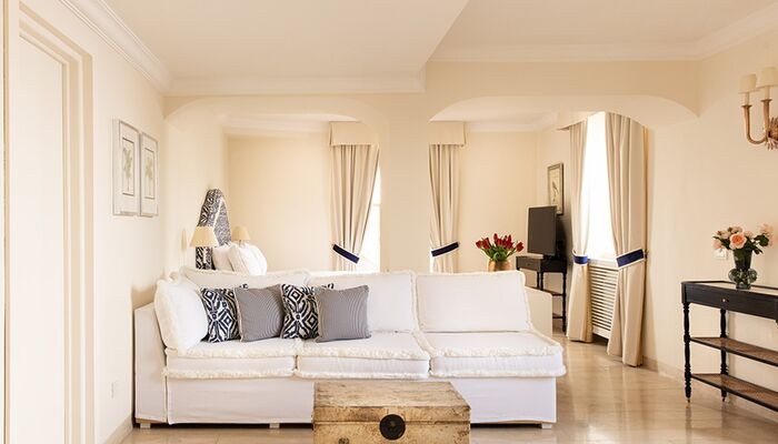 Fenster mit Meerblick, direkt am Meer, im alten Turm aus dem 16. Jahrhundert gelegen. Ein Doppelbett. Jede Suite besteht aus Wohnzimmer, Schlafzimmer und Badezimmer. Das Schlafzimmer ist mit einem Kleiderschrank, Sat-TV, einer Minibar, einem Schreibtisch, einem Telefon und stilvollen Möbeln ausgestattet. Das Wohnzimmer verfügt über ein Schlafsofa für Kinder. Das Badezimmer ist mit einer Whirlpool-Badewanne, einem Marmorwaschbecken, einem Bidet, einem Haartrockner, einem Telefon und einem Kosmetikspiegel ausgestattet. Klimaanlage. Zimmersafe.