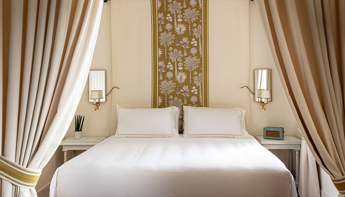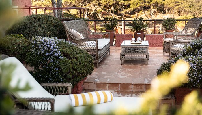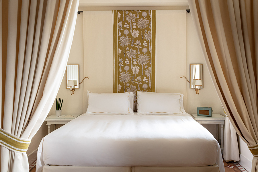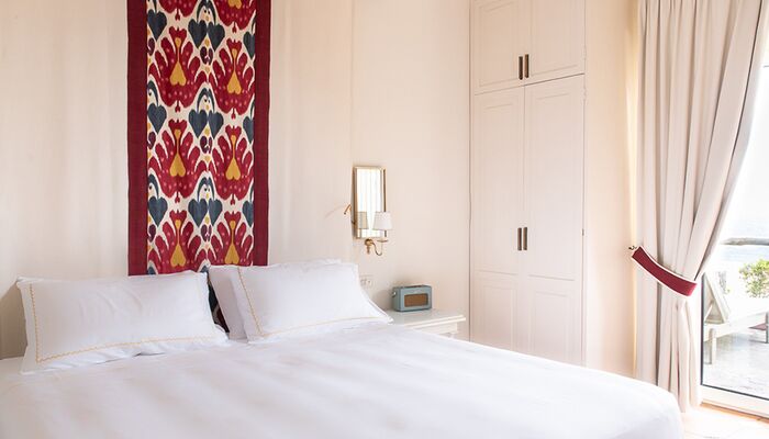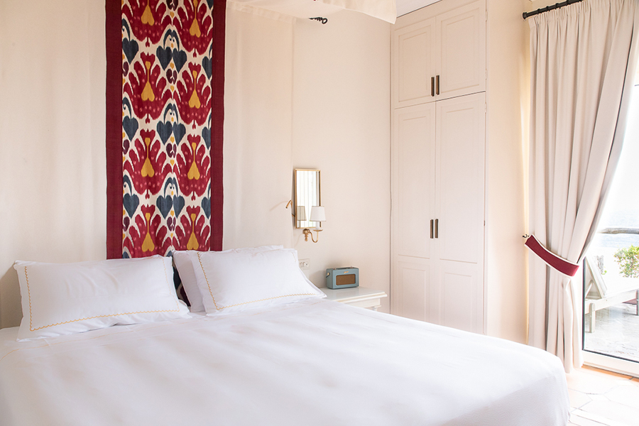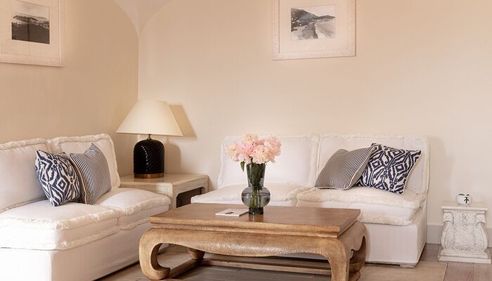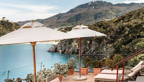 Terrasse und Garten mit Meerblick – (mind. 4 Pers.), geschützt unter dem dichten Pinienwald, der Teil des Hotelgeländes ist, ist diese große Familiensuite der perfekte Zufluchtsort für Natur- und Ruheliebhaber. Spazieren Sie durch den privaten Garten, der mit verschiedenen exotischen Pflanzen und Blumen bepflanzt ist, und genießen Sie die wunderschöne Aussicht auf die Bucht von Zaro und die kleine Insel Ventotene. Die Innenräume verfügen über ein großes Wohnzimmer aus Stein und gebeiztem Holz, ausgestattet mit weichem Chenille und üppigen Vorhängen, ein Doppelzimmer mit Baldachin.