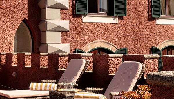 Terrasse mit Parkblick – Gebäude Visconti, im Park gelegen – Gebäude Visconti – mit kleiner Terrasse und Parkblick – Ein Doppelbett. Jedes Zimmer verfügt über aufeinander abgestimmte Möbel und Farben, einen Einbauschrank, einen Tisch, 2 Telefone (eines im Badezimmer), Sat-TV, Minibar, Badezimmer mit Marmorwaschbecken, Bidet, Badewanne, Haartrockner und Kosmetikspiegel. Klimaanlage. Zimmersafe.
