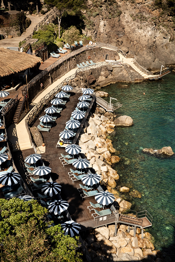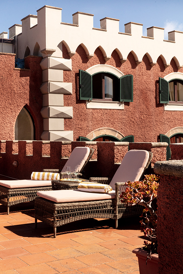 Sieben Hektar Macchia Mediterranea (italienischer Niederwald) und subtropische Pflanzen umgeben den Turm und die Zimmer. Dank des leichten Zugangs zum Meer hat der Gast den Vorzug, in einer der stimmungsvollsten Buchten der Insel zu schwimmen. Das gastronomische Angebot besteht aus zwei Restaurants. Eins liegt direkt neben dem Turm, während das mit einem typischem Palmwedeldach ausgestattete zweite Restaurant auf das Meer schaut.