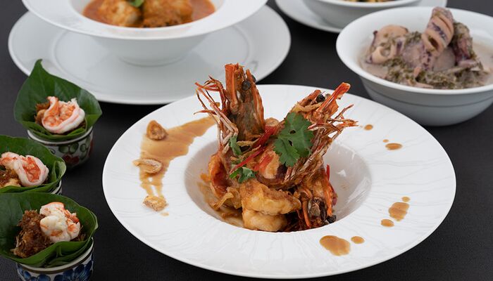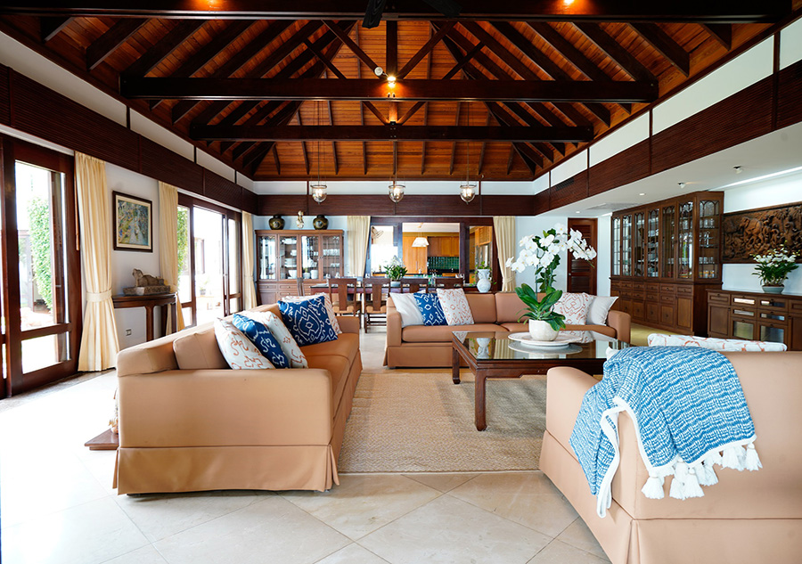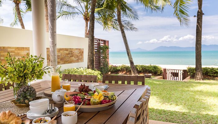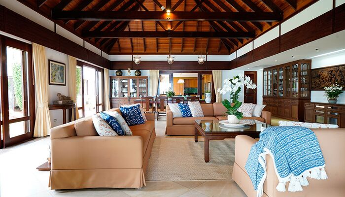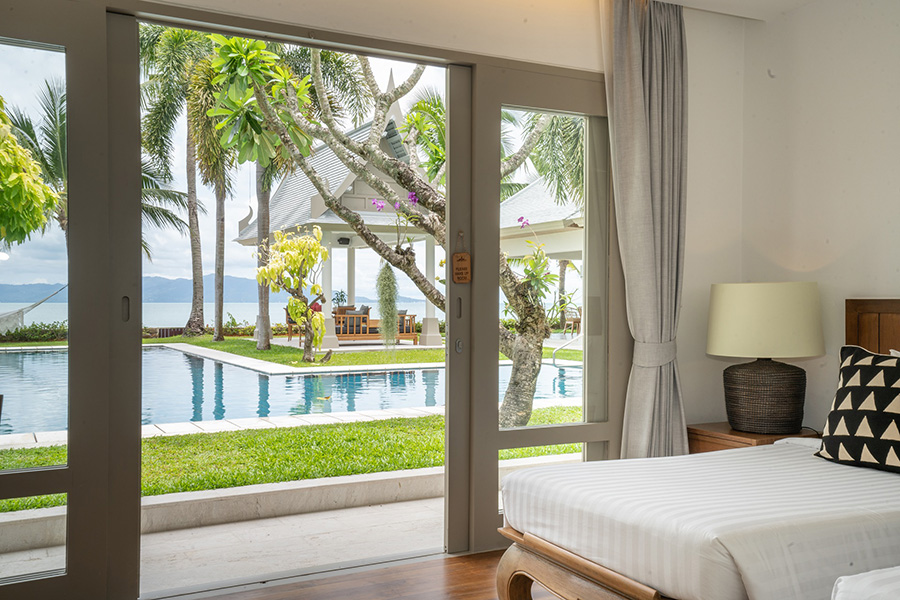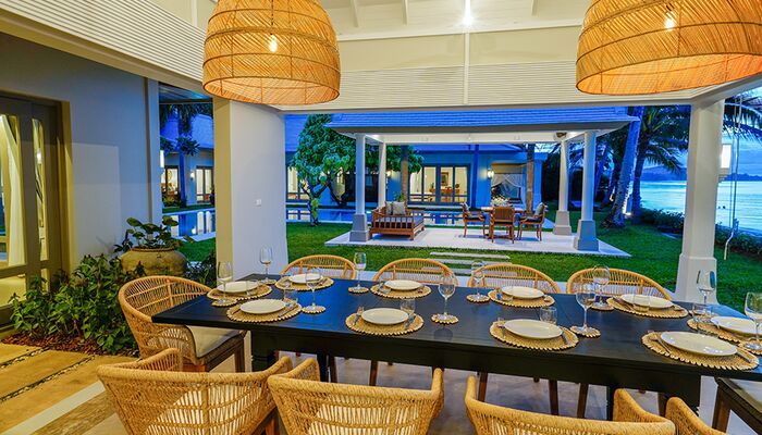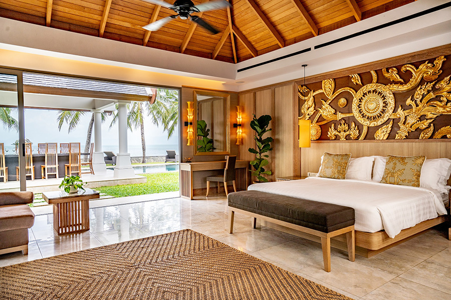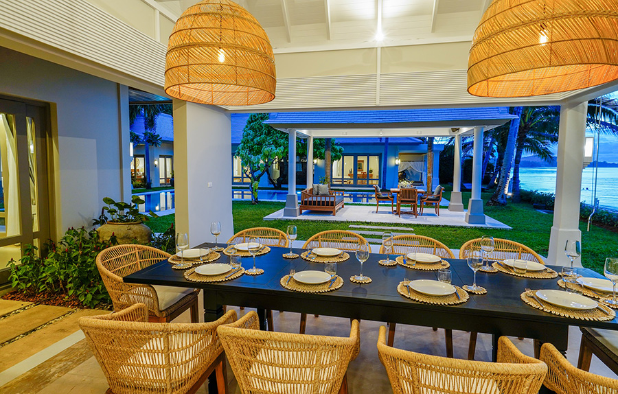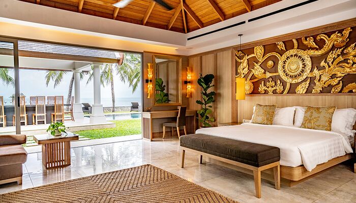 Mit getrennten Wohn- und Essbereichen ist diese Villa mit fünf Schlafzimmern ideal für Familien, die getrennte Bereiche zum Unterhalten und Entspannen suchen. Cremefarbene Wände, lokale Schnitzereien und viel Holz vereinen sich zu einer traditionellen thailändischen Ästhetik, während die 27 Meter lange, unberührte Strandfront der Villa eine beeindruckende Aussicht bietet. Auch als Villa mit drei bis vier Schlafzimmern verfügbar.