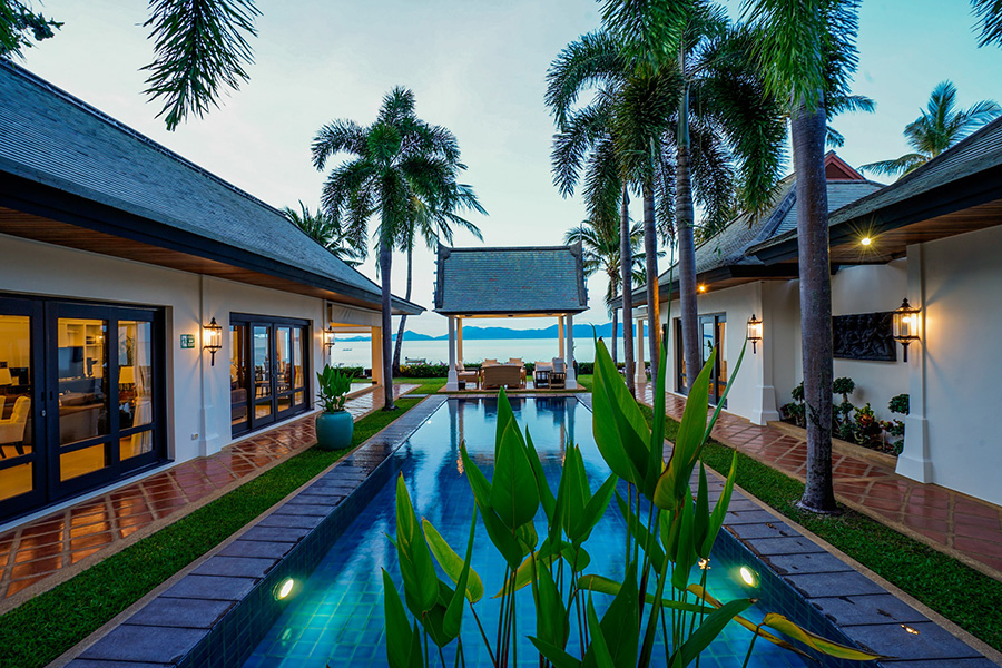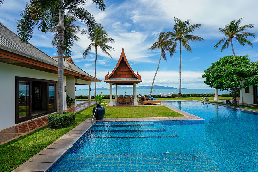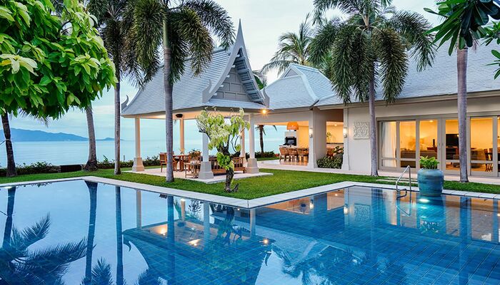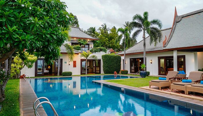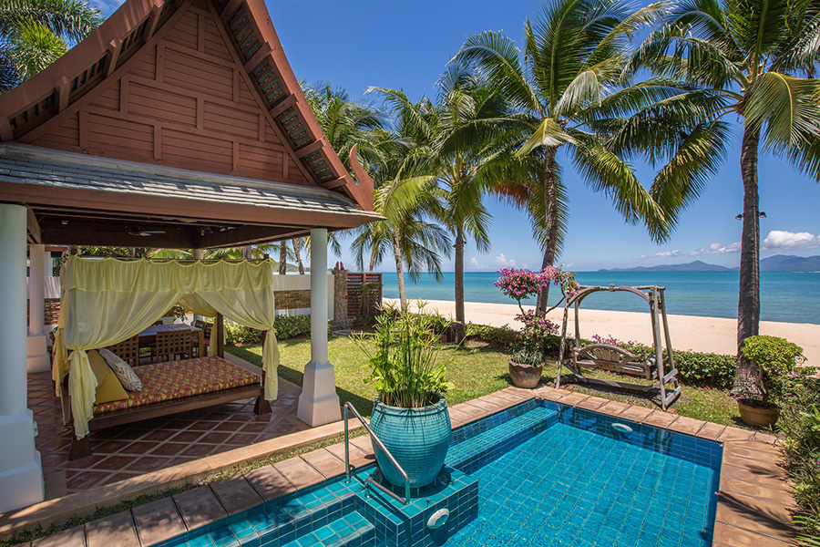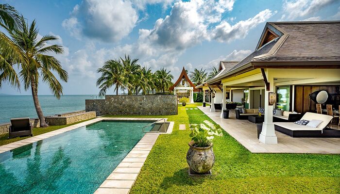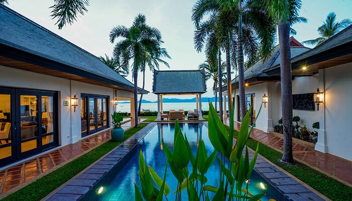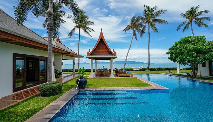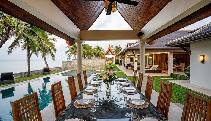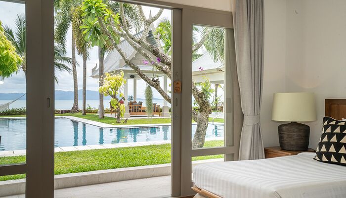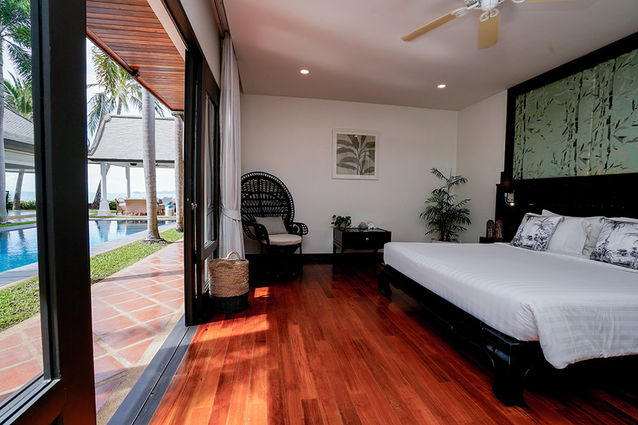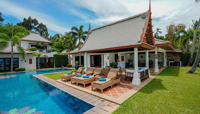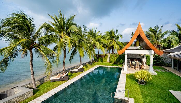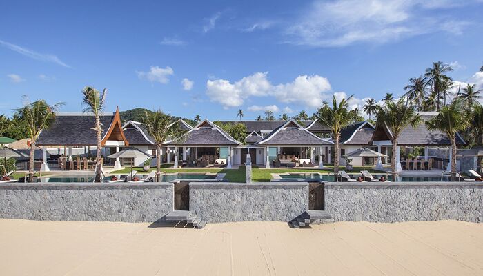 Diese atemberaubende Villa mit fünf Schlafzimmern versetzt Sie mit ihrem modernen weiß getünchten Interieur, den Holzschnitzereien und den Rattanmöbeln nach Bali. Um die beeindruckenden 36 Meter Strandfront optimal zu nutzen, ist jedes Zimmer um den Pool herum angeordnet, während das großzügige Gelände tropische Gärten, eine schattige Thai-Sala und einen großen Wohnbereich bietet. Auch als Villa mit drei bis vier Schlafzimmern verfügbar.