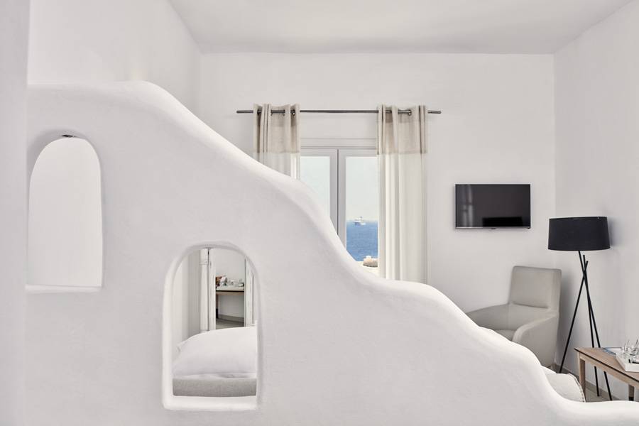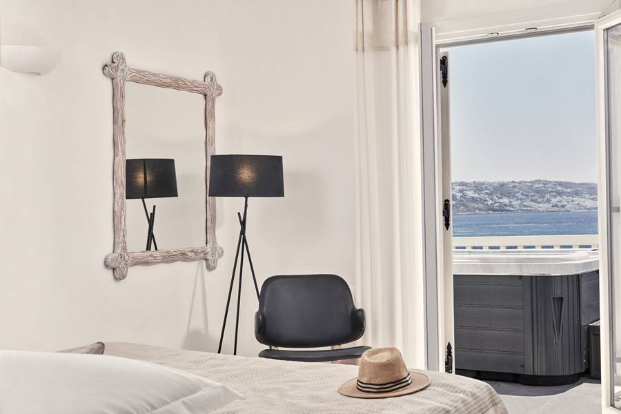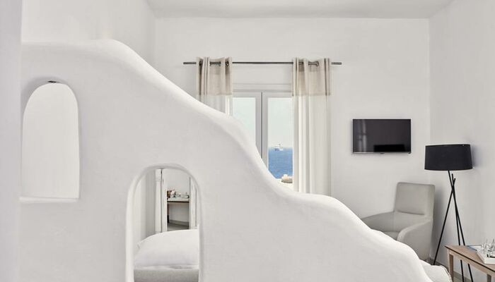 Unsere herrlichen Junior-Suiten mit offenem Schnitt bieten einen atemberaubenden Ausblick und eine einzigartige Landschaft. Einfach perfekt, um den Gästen ein unvergessliches Erlebnis der Kykladen zu bieten. Bei ca. 28-32 m² Größe bieten die Junior Suiten Meerlblick bieten Platz für bis zu drei Personen. Lassen Sie sich in Ihrer verlockenden Suite zurücklehnen und beruhigen Sie Ihre Sinne mit seinem irdischen Farbton, nachdenklichen Komfort und ruhigen Texturen. Unsere Junior Suite mit Meerblick bietet Ihnen alles, was Sie brauchen, um einen unvergesslichen Urlaub auf Mykonos zu gestalten.