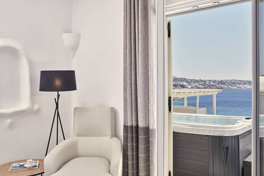 Unsere Deluxe Suiten mit Meerblick von ca. jeweils 40-45 m² große, luxuriöse Suiten mit einem Schlafzimmer bieten ein geräumiges Wohnzimmer im offenen Stil und ein einzigartig gestaltetes Bad mit Dusche. Sie können bis zu drei Personen beherbergen, während reine Linien und eine stilvolle, irdische Palette Sie mit opulentem zeitgenössischem Luxus umgeben. Diese Suiten verfügen über eine Veranda mit einem privaten Whirlpool im Freien, wo Sie sich entspannen und die atemberaubende Aussicht auf die Ägäis genießen können. Genießen Sie das Leben im Mykonos Princess Hotel auf die schönste Weise.