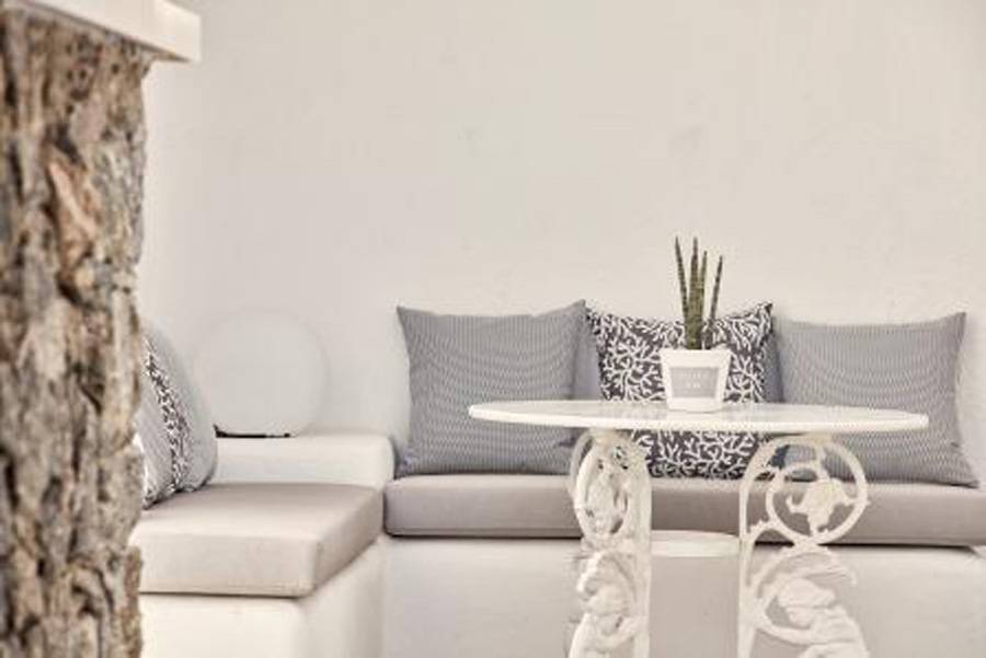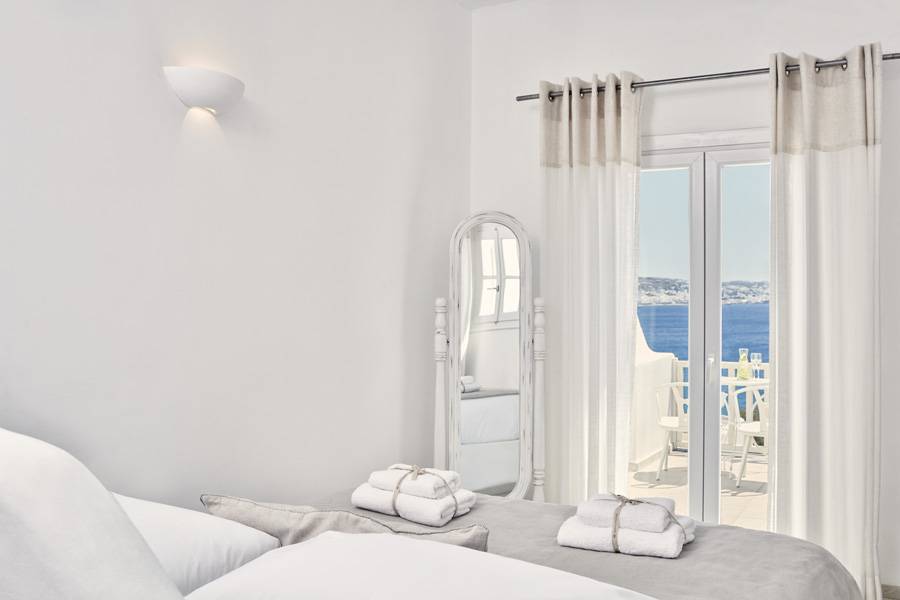 Diese atemberaubenden Suiten in der oberen Etage bieten ein Schlafzimmer mit einer romantischen Badewanne und ein separates Bad mit Dusche. Sie verfügen über ein separates, komfortables Wohnzimmer und zwei Balkone mit atemberaubendem direktem Blick auf die Ägäis und die Insel, wo das azurblaue Himmel und das Meer sich harmonieren.