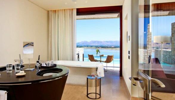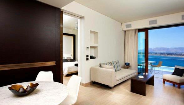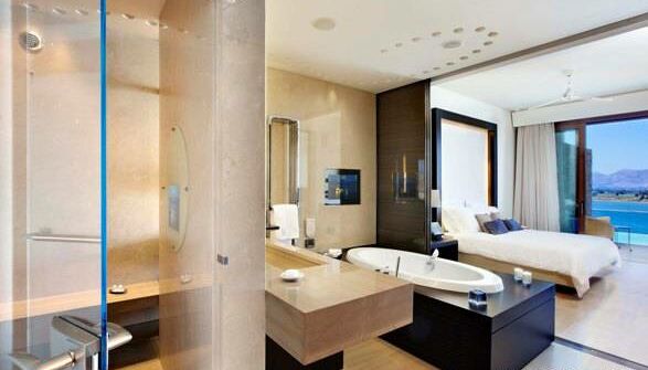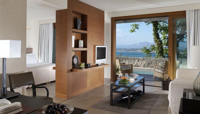 Exclusive Club: Die Villen mit einem oder zwei Schlafzimmern verfügen zumeist über einen Privatpool. Sie haben eine herrliche Aussicht auf die Bucht von Argolis. Die Luxusvillen dieser Kategorie bieten einen atemberaubenden Meerblick und verfügen teilweise über private Pools. In den mit Marmor edel ausgekleideten Badezimmern erwarten Sie Jacuzzi oder Aerospa-Wannen und Extra-Duschkabinen. Einige Villen haben separate Wohnzimmer. Vorhänge, Fernseher, Beleuchtung usw. lassen sich mit einem Fingertipp auf dem Touch-Screen bedienen.