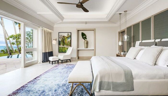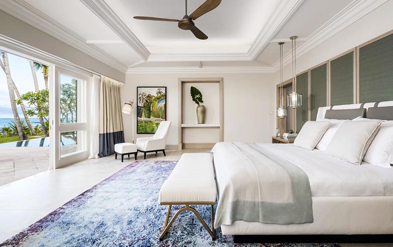 Die Villa: Die Villa herrscht mit ihrem entspannten und diskreten Luxus, dem privaten Swimmingpool und dem separaten Eingang. Ein Team von Kammerdienern, Butler und Koch ist ständig vor Ort. Mit zwei geräumigen Schlafzimmern befindet sich die Villa in einer ruhigen Ecke des Anwesens. Die Villa erinnert an ein klassisches Inselhaus und bietet einen klaren Blick auf den Indischen Ozean über einen privaten Pool und eine geräumige Terrasse. Das Hauptschlafzimmer verfügt über ein prächtiges Himmelbett und das zweite Schlafzimmer über zwei Queensize-Betten. Jedes der beiden Badezimmer verfügt über eine kaskadierende Dusche, einen Whirlpool und einen Waschtisch für Sie und Ihn. Eine voll ausgestattete Küche und ein geräumiges Wohn- / Esszimmer mit hochwertigem Porzellan, Kristall und Besteck sind ideal für die Unterhaltung einer kleinen Gruppe oder für ein privates romantisches Abendessen.