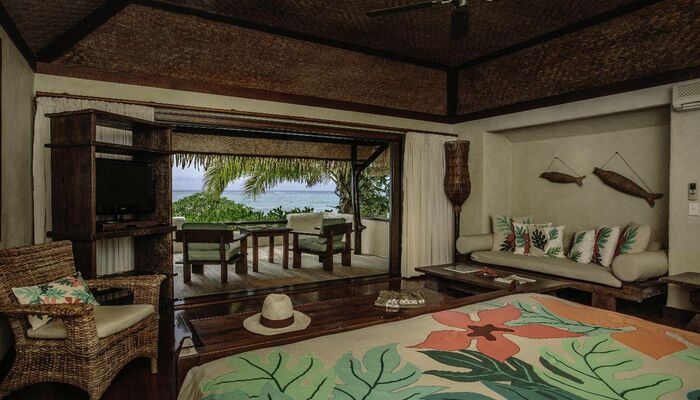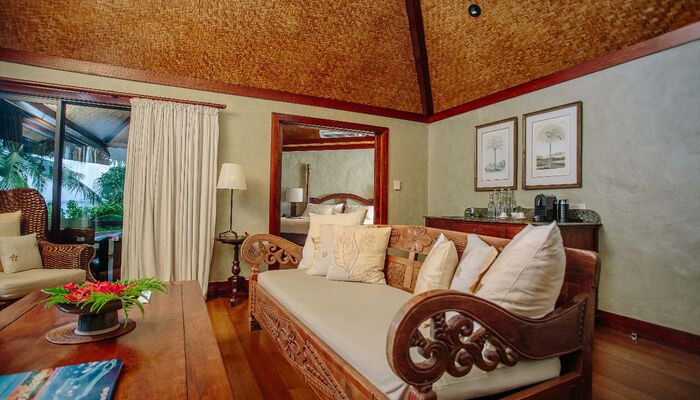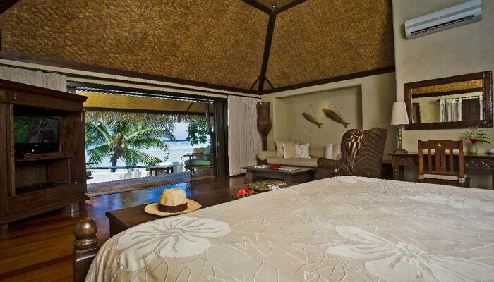 Beachfront Suite - Einzelne Gebäude am Sandstrand von Aitutaki, umgeben von herrlichen tropischen Blumengärten von etwa 947 Quadratmetern mit Panoramablick über die Lagune. Alle Suiten verfügen über Kingsize-Betten, IDD-Telefon, TV, CD-Stereoanlage, Zimmersafe, Klimaanlage, Deckenventilatoren, Haartrockner, Minibar, Stranddusche, Tagesbetten im Innen- und Außenbereich, Bad im Innen- und im Garten sowie private Sonnenterrassen.