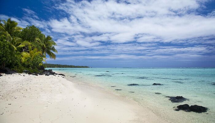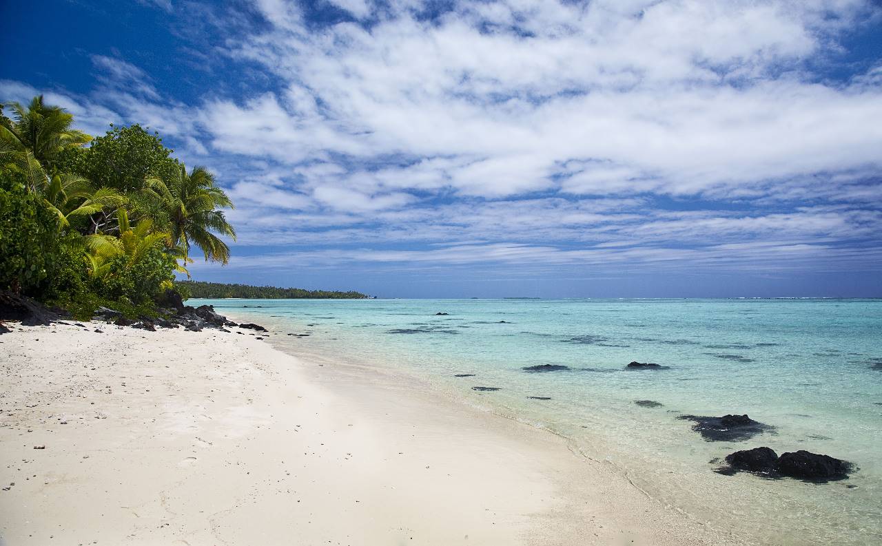 Der weiße Sandstrand von Muri erstreckt sich über einen Kilometer entlang der Südostküste der Insel und ist auf der einen Seite von schwankenden Palmen und auf der anderen Seite von sanften Wellen gesäumt.