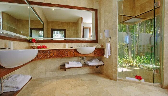 Strandvilla - 3 Strandvillen - Wunderschön gestaltete, geräumige Villen auf 2 Ebenen auf spektakulärem schwarzem Vulkangestein. Ungefähr 1345 Quadratfuß groß, einschließlich sensationeller privater Doppel-Sonnendecks im Freien und privater Garten-Badezimmer im Freien. Die Villen verfügen über ein separates Schlafzimmer und ein Wohnzimmer. Sie sind klimatisiert und verfügen über Kingsize-Betten, ein IDD-Telefon, einen individuellen TV / DVD-Kombi, eine CD-Stereoanlage, einen Zimmersafe, einen Deckenventilator, einen Haartrockner, eine Minibar, eine Stranddusche, ein Bad im Innen- und ein privates Außenbad sowie ein doppeltes Sonnendeck mit Panoramablick Aussicht und eine Außentreppe schlängelt sich zum Strand hinunter.