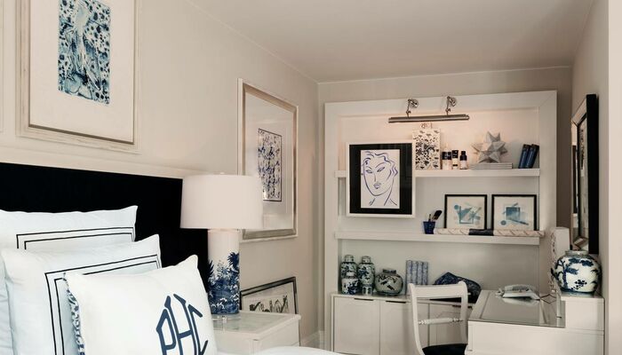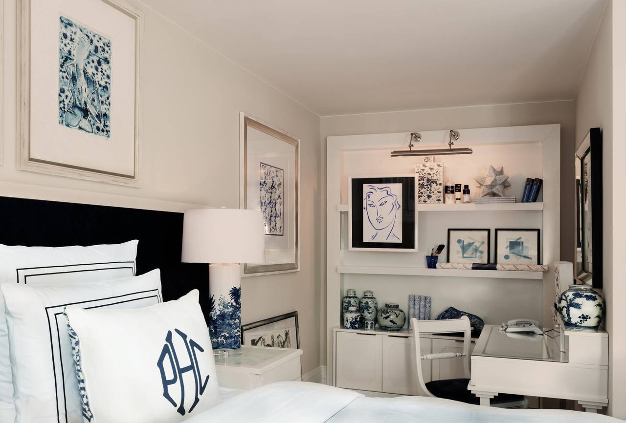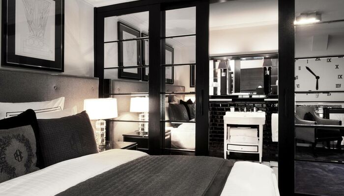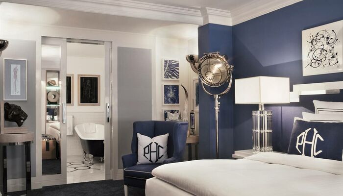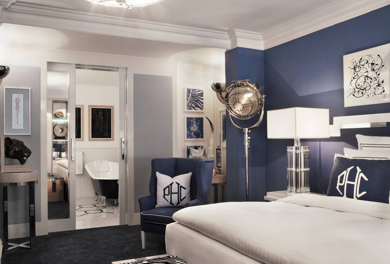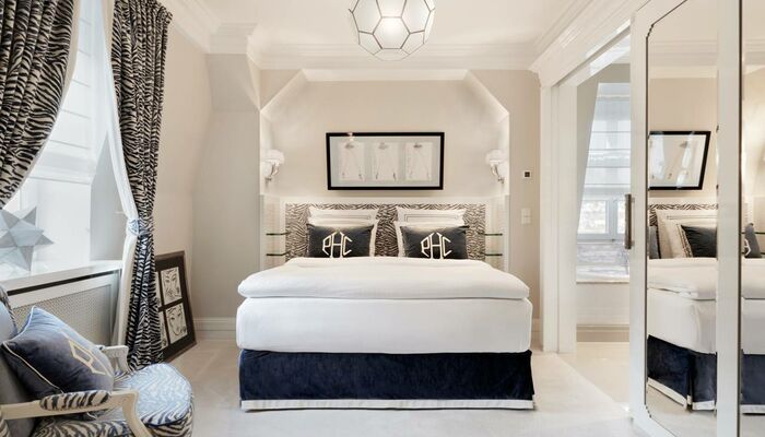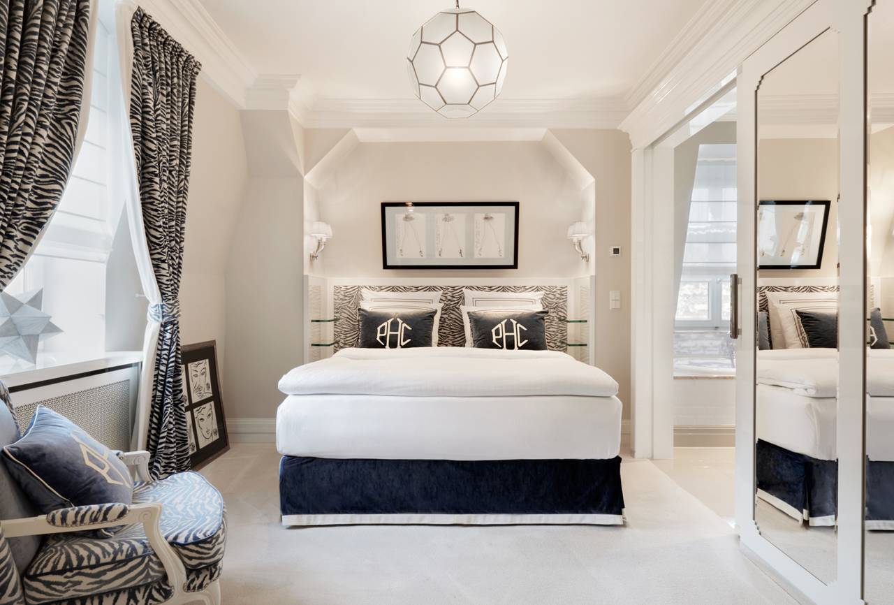 Die Zimmer sind durchdacht und in prächtigen Stoffen gekleidet, die für Patrick Hellmann Collection Anzüge (Samt, Seide und Grau Flanell) mit meisterlich gestickten Details, die Sie normalerweise erwarten, auf einem Couture Kleidungsstück zu sehen verwendet werden. Um ein echtes New-York-Leben zu reflektieren, fügte Patrick Hellmann Details hinzu, darunter individuell gestaltete Sessel, geräumige Schränke, ein Arbeitsschreibtisch und Black-out-Vorhänge aus der Krawatte aus Seide aus Patrick Hellmann Collection. Eine friedliche Mischung aus grauen, violetten, schwarzen und weißen Tönen bewahrt die richtige Balance zwischen Wohnkomfort und raffinierter Eleganz.