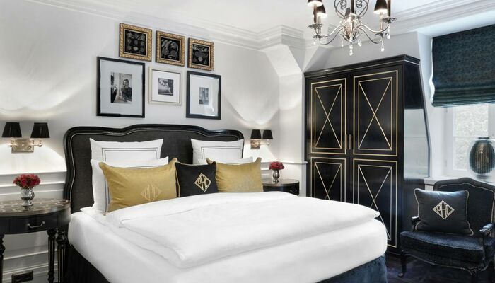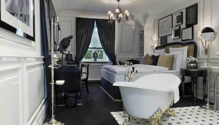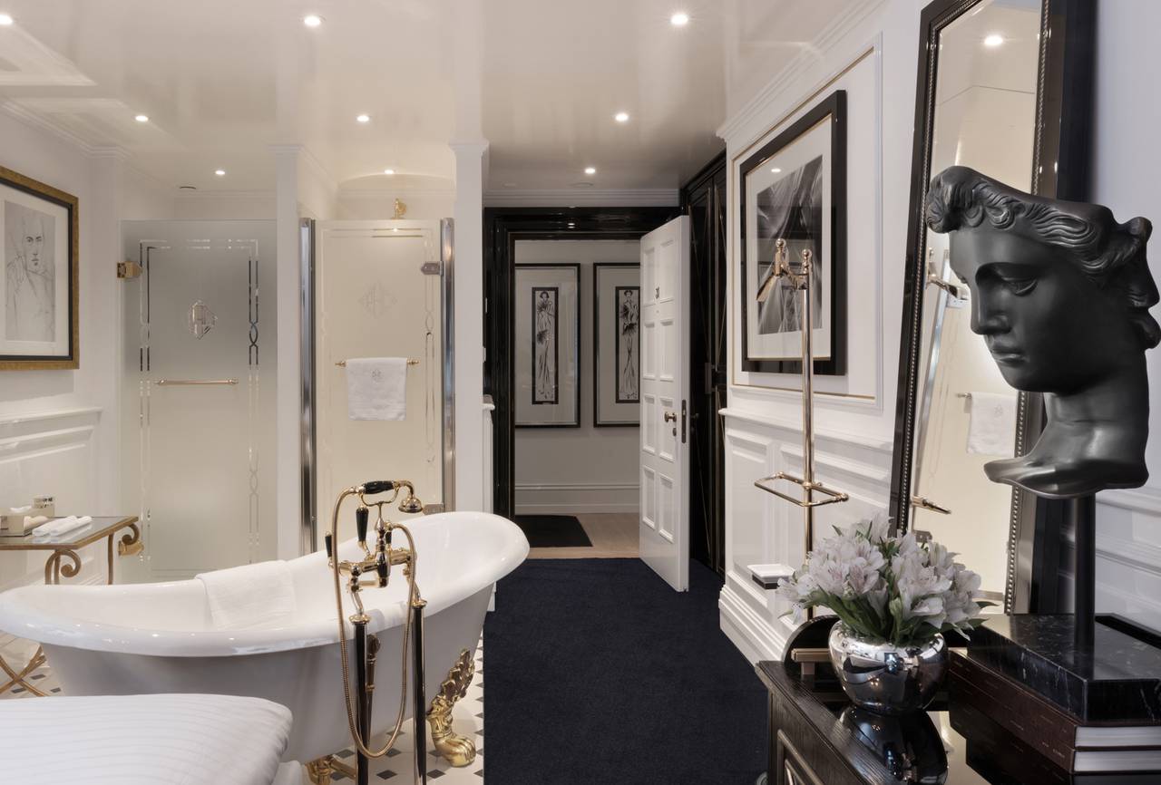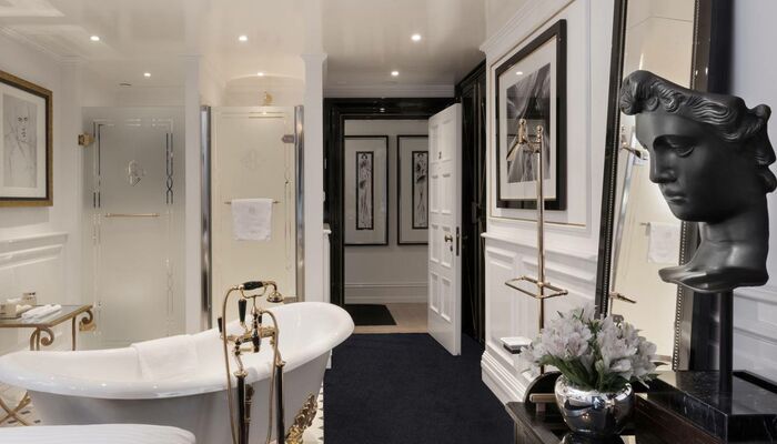 Die Höhepunkte der Suite sind das beeindruckende Designer Bett (230 cm x 210 cm), die extravagante Möblierung und das großzügige romantische Art Deco Badezimmer mit handgemachten, französischen Kacheln und weißem Marmorfußboden.