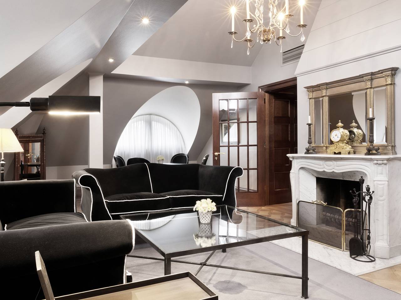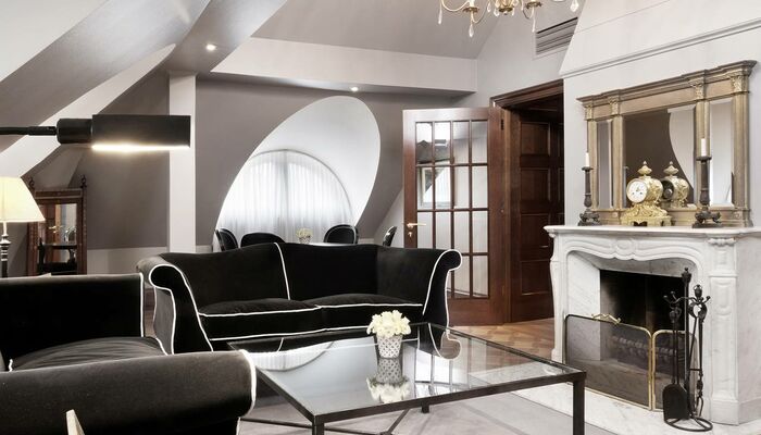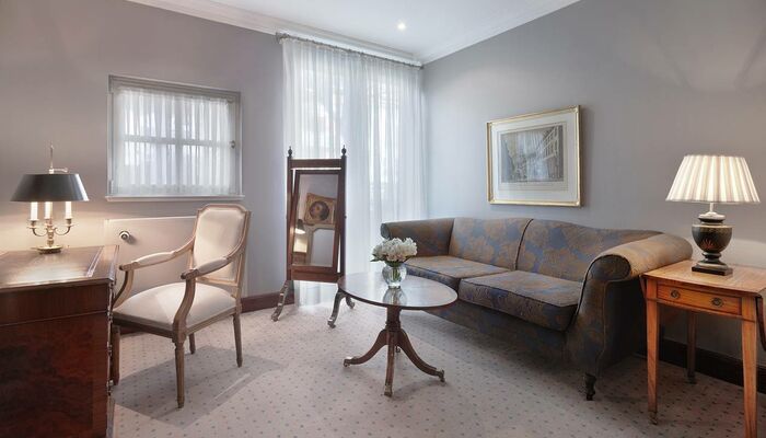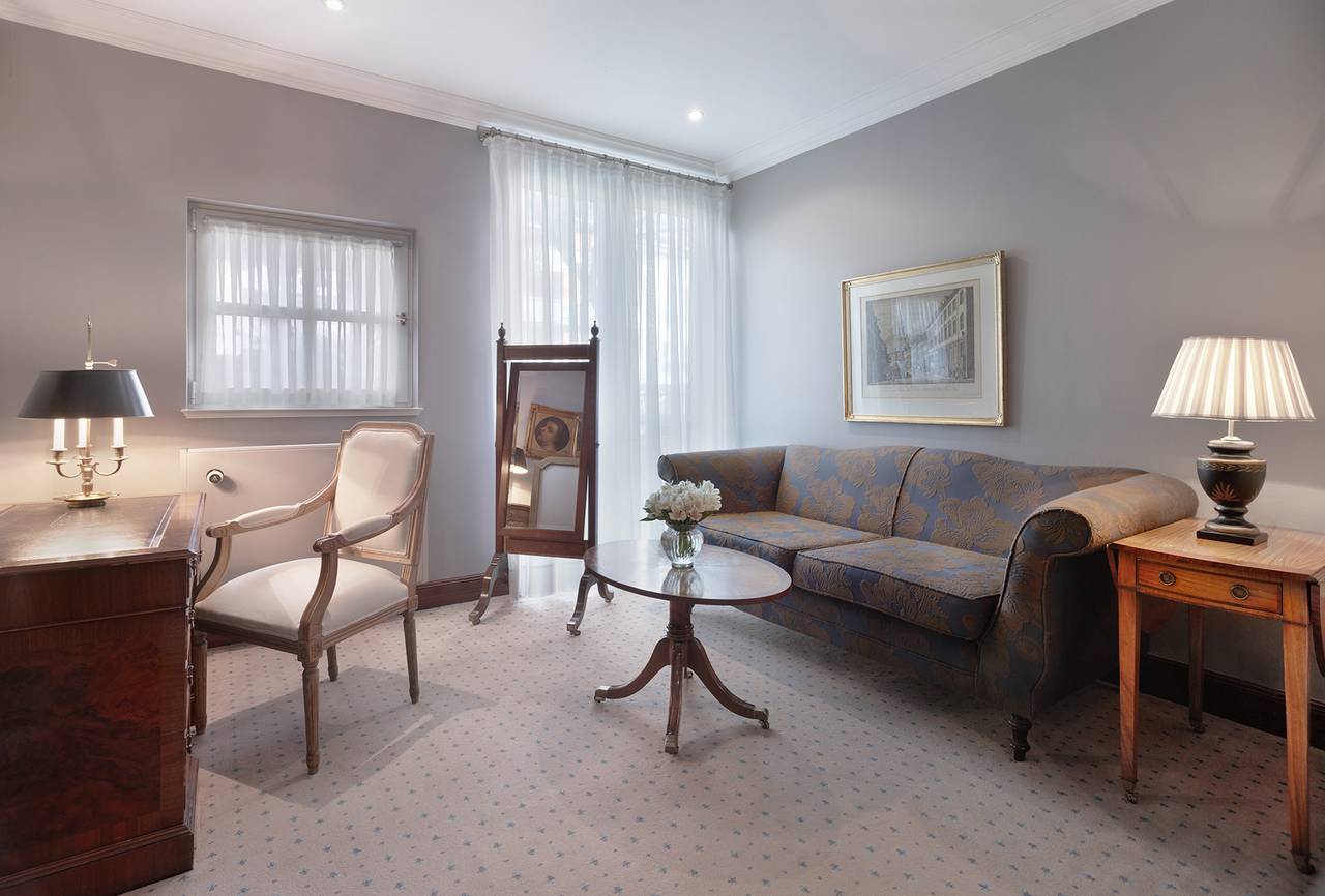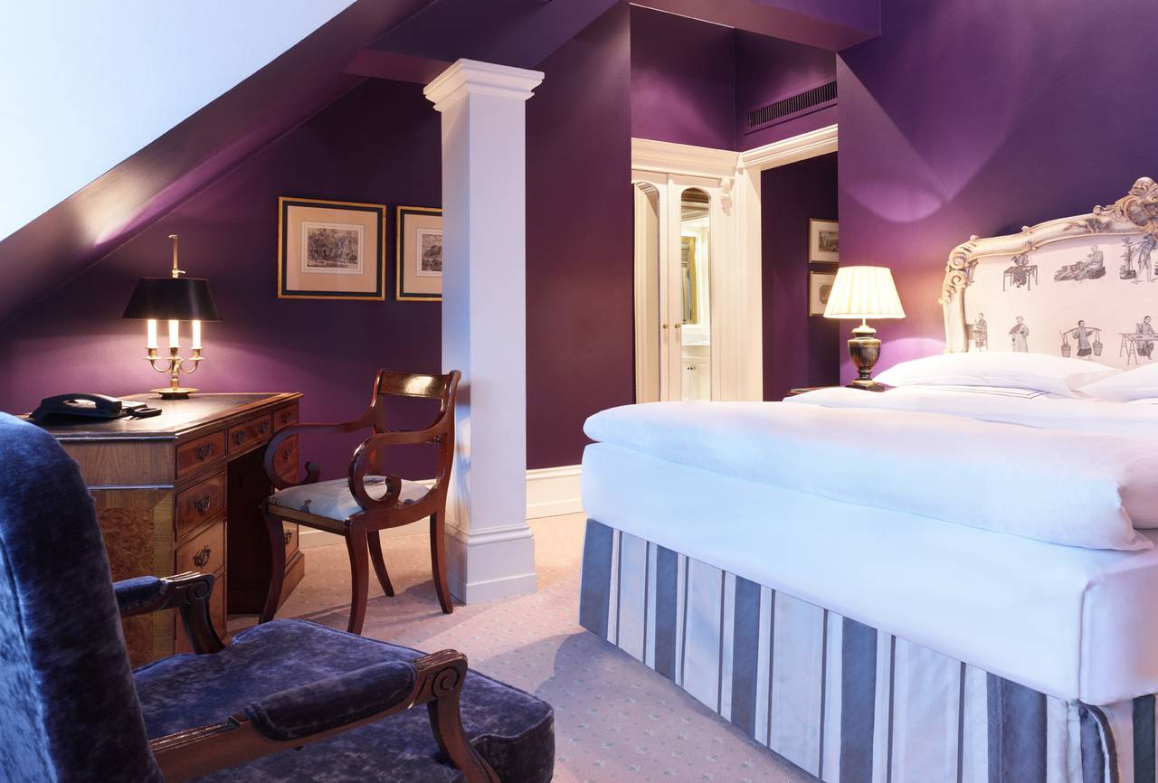 Die Library Suite ist eine unserer Signature Suiten. Eine Dachgeschoss-Suite mit 95m², gewölbten Decken und klassischer Ausstattung. Sie verfügt über einen Eingangsbereich mit Gästebadezimmer, einem exquisiten Büro, ein Schlafzimmer sowie ein Wohnzimmer, das ausgestattet ist mit einem französischen Kamin und Essbereich. Das Master-Badezimmer ist in elegantem Stil gehalten, ausgestattet mit Marmor in warmen Terracotta- und Beigetönen, Fußbodenheizung, separatem WC, Bvlgari Pflegeprodukten und einem romantischen Boudoir mit Blick in den Garten.