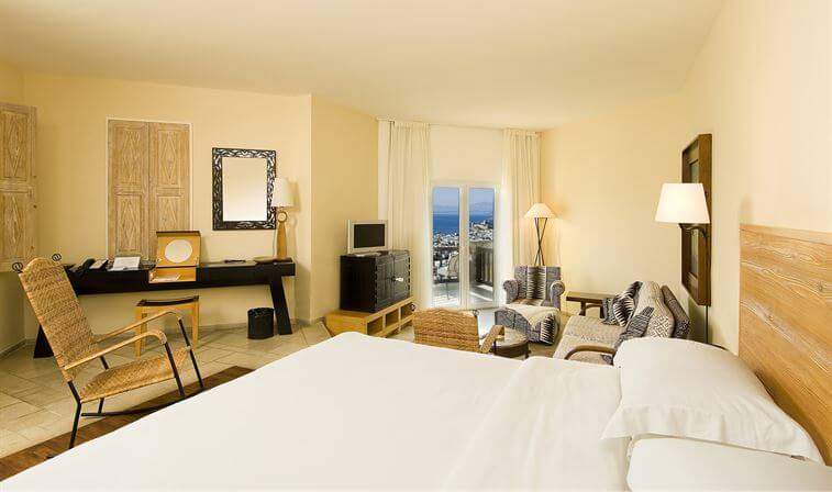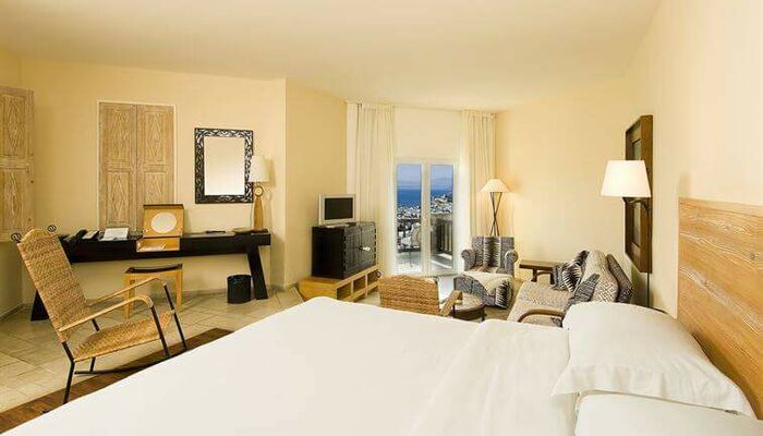 Die Bella Vista Suite verfügt über ein 35 m² großes Schlafzimmer sowie eine 45 m² große Wohnfläche sowie eine 150 m² große private Terrasse mit Blick auf die Ägäis und eigenem Whirlpool, Dusche, Sonnenliegen und Sonnenschutz. Das Schlafzimmer, das sich zum Balkon hin öffnet, verfügt über ein bequemes Kingsize-Bett, einen Kleiderschrank und ein geräumiges Badezimmer mit einer Whirlpool-Badewanne und einer separaten Dusche sowie einem schicken Waschtisch. Der Wohnbereich ist mit einer gemütlichen Sitzgruppe und einem Make-up-Schreibtisch mit Spiegel eingerichtet.
